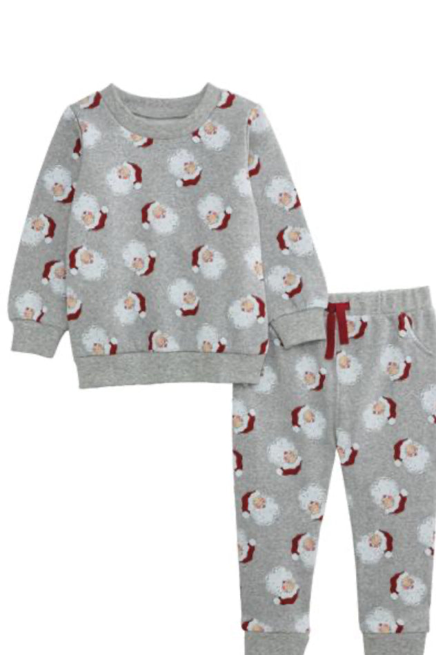 The Grey Santa Toddler Jogger Set is a delightful 2-piece ensemble perfect for keeping your little one cozy and stylish. The brushed French terry sweatshirt features a soft cotton rib neckline, sleeve openings, and hem, ensuring comfort and ease of movement. The coordinating pull-on pants complete the look, offering a snug fit with their elastic waistband. Available in a large size suitable for toddlers aged 4T-5T, this set is crafted from a blend of 87% cotton and 13% polyester for the body, while the cuffs are made from 99% cotton and 1% spandex, providing just the right amount of stretch. Ideal for playtime or lounging, this jogger set combines practicality with a festive touch, making it a must-have addition to your child's wardrobe.