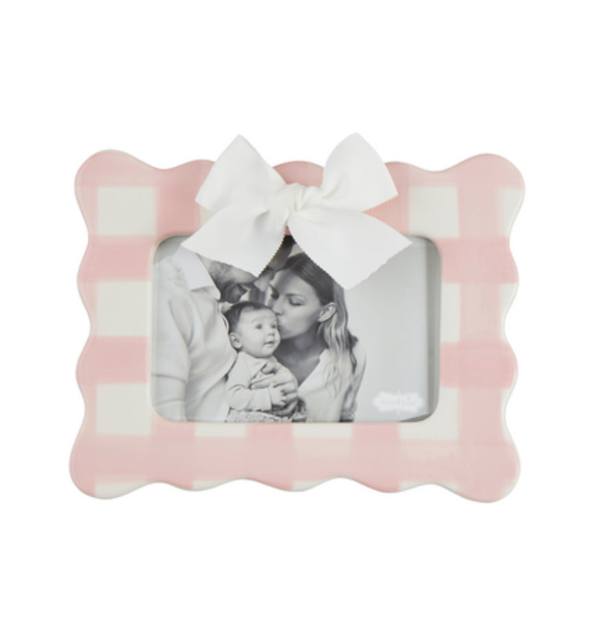 This exquisite hand-painted ceramic frame is a perfect blend of artistry and elegance, designed to beautifully showcase your cherished memories. Measuring 4" x 6", it features a charming scallop edge that adds a touch of sophistication to any room. The frame is adorned with a delightful hat ribbon bow, enhancing its whimsical appeal and making it a standout piece in your home decor. Crafted from high-quality dolomite, the frame measures 9" x 7" overall, providing a sturdy and durable structure that ensures your photos are displayed with grace. The easel back design allows for easy placement on any tabletop or shelf, making it a versatile addition to your living space. Whether you're looking to add a personal touch to your home or searching for a thoughtful gift, this hand-painted ceramic frame is sure to impress with its unique design and timeless charm