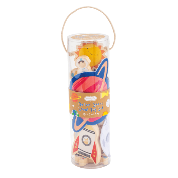 Outer Space Wood Toy Set. This captivating 13-piece wooden toy set is perfect for young explorers eager to embark on intergalactic adventures. Crafted from high-quality pine wood, each piece is designed to inspire creativity and imagination. The set includes astronauts ready for space missions, sleek space ships for thrilling journeys, and celestial bodies like Earth, Saturn, and the Moon to explore. An alien UFO adds an element of mystery, while a comet and the radiant Sun bring the wonders of the universe to life. A satellite and telescope are included for aspiring astronomers to observe the cosmos. Suitable for children ages 3 and up, this durable and beautifully crafted set encourages educational play and endless storytelling possibilities.