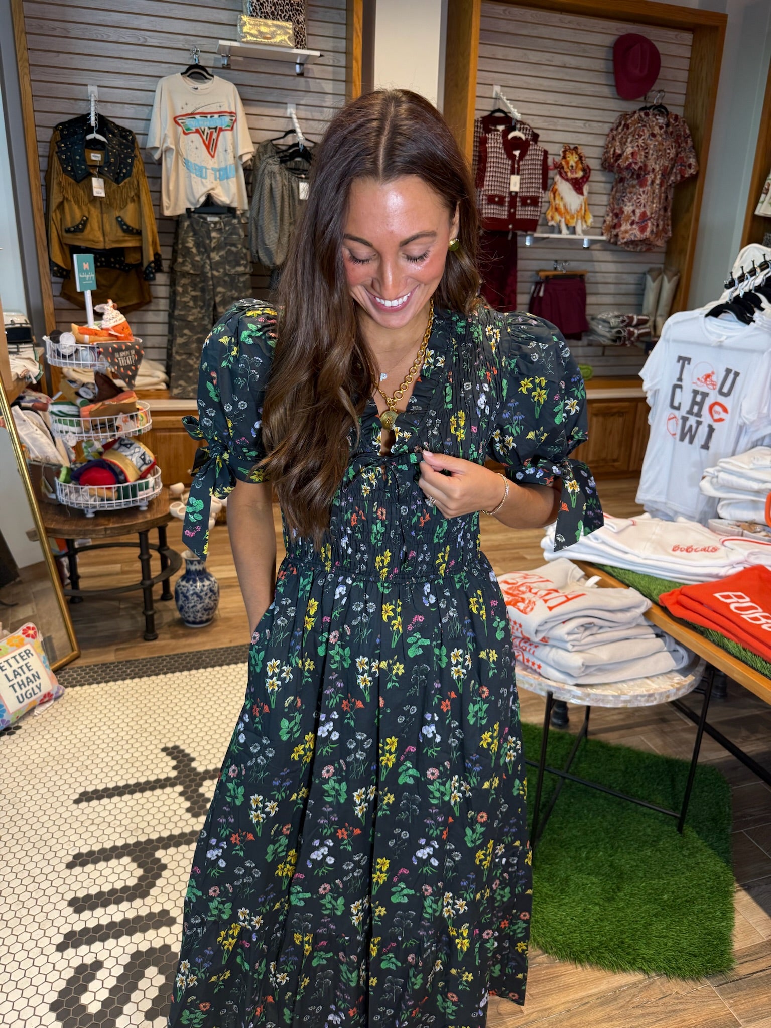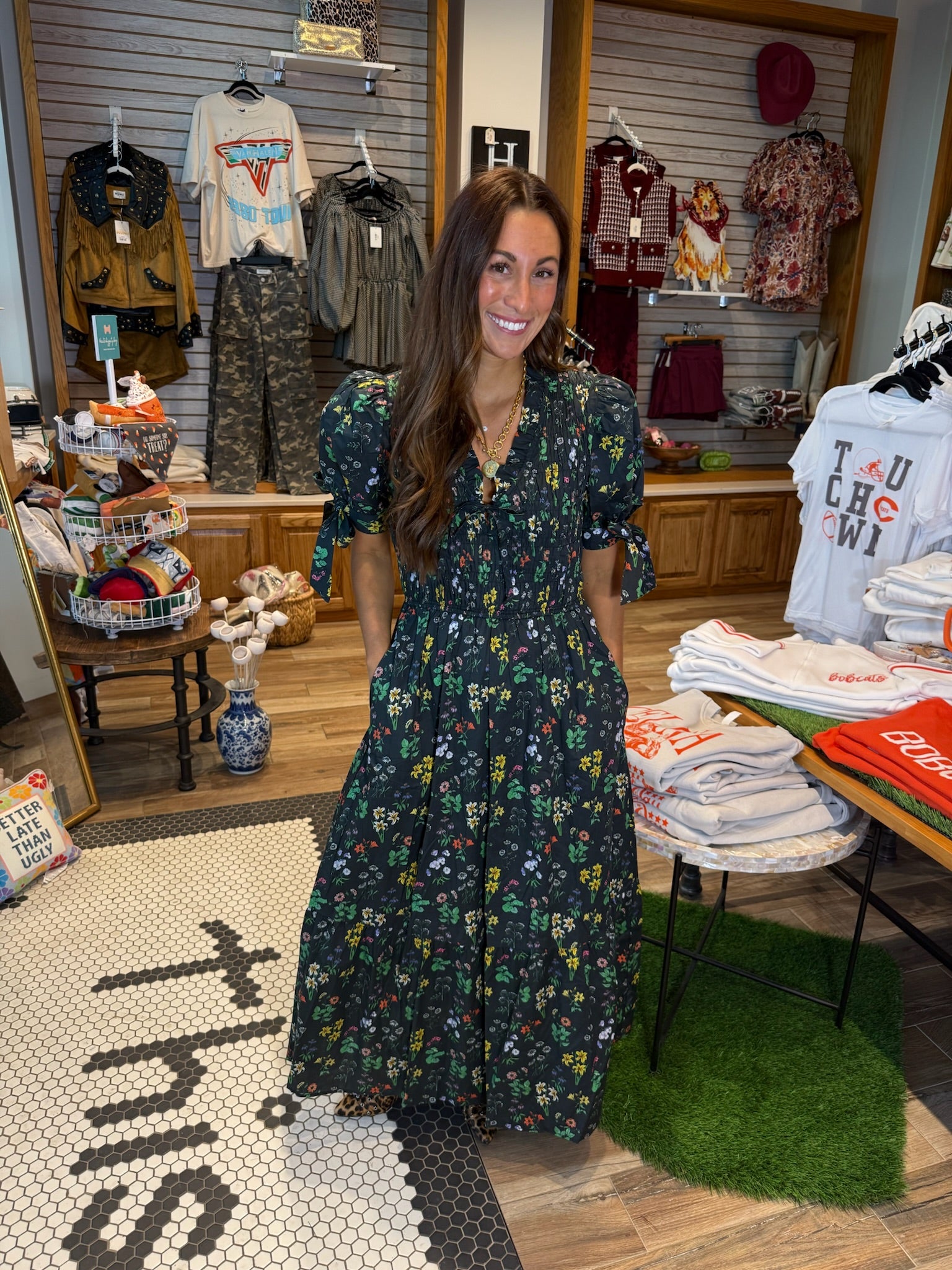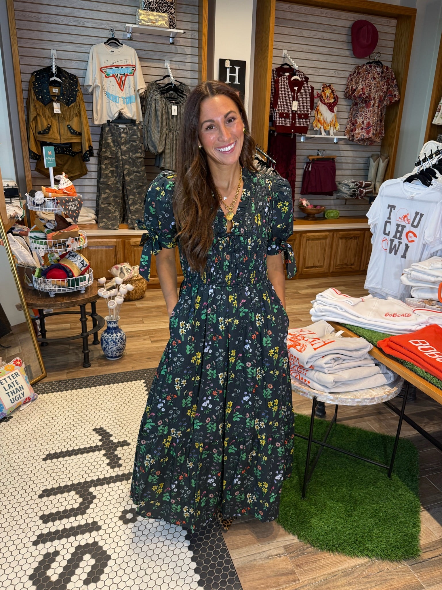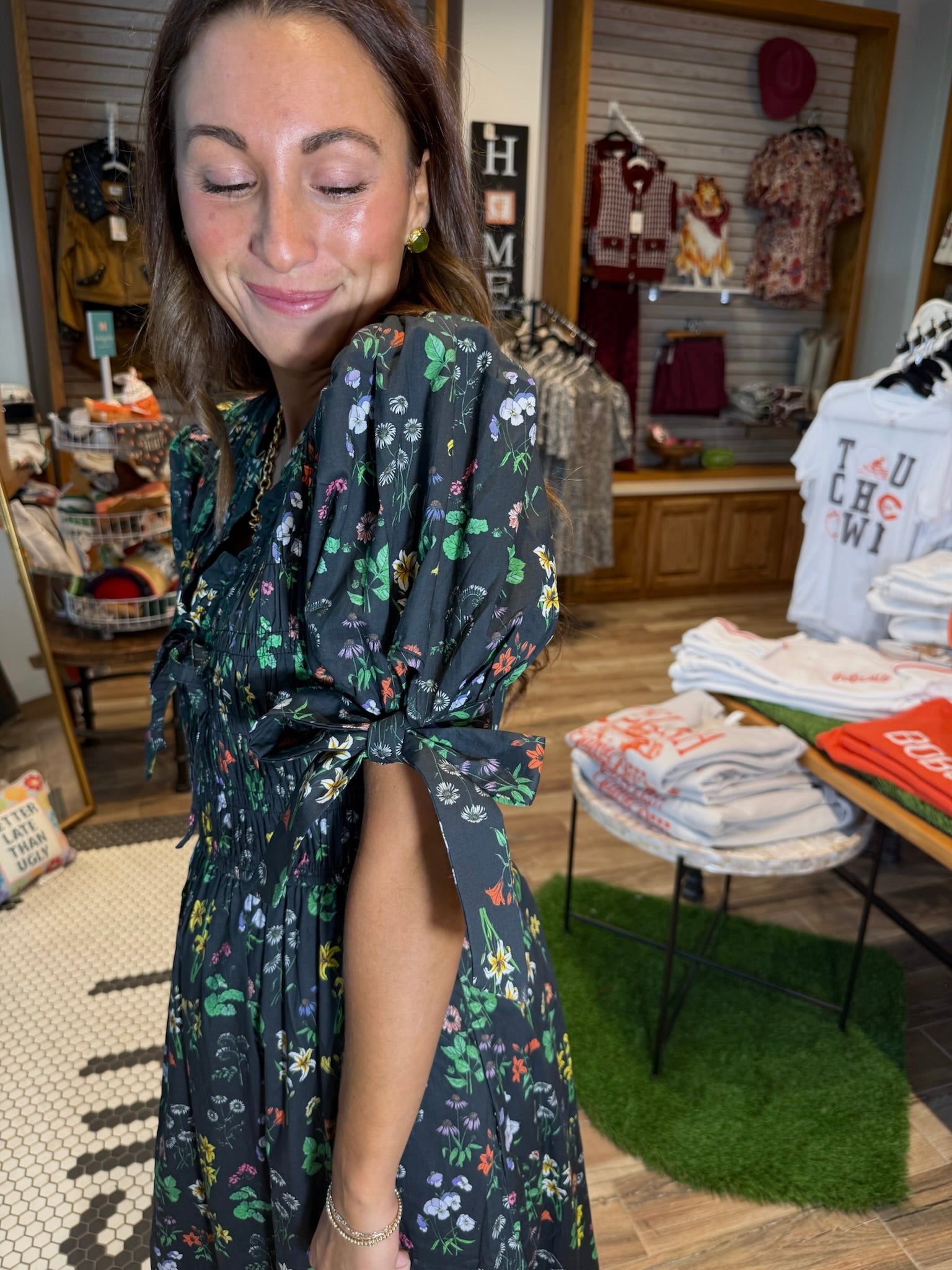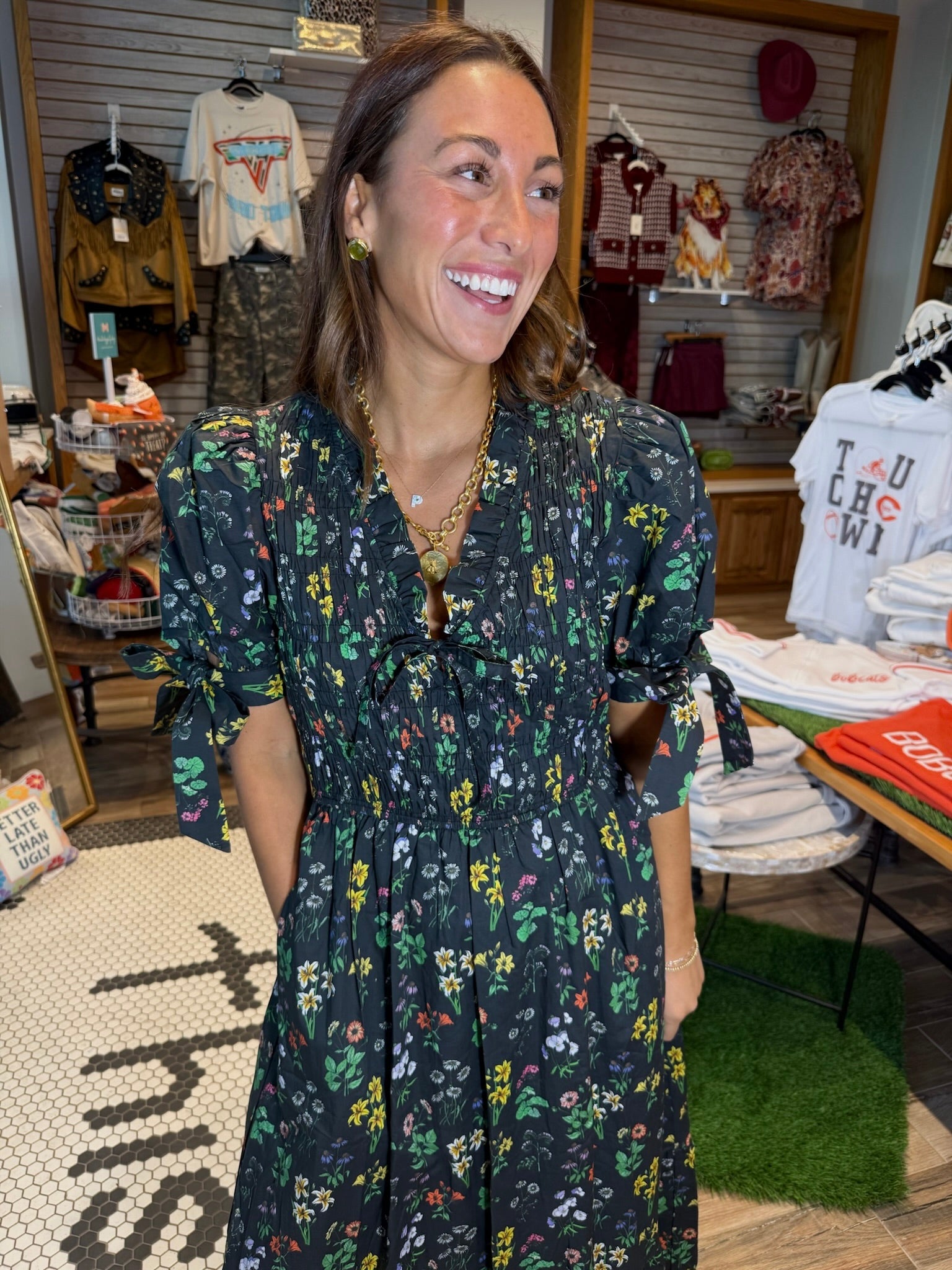 Multi-floral print bow tie band short sleeve midi dress featuring front smocked V-neck bow tie closure. Elasticated waist. Side pockets. Lined. Woven. Non-sheer. Lightweight.