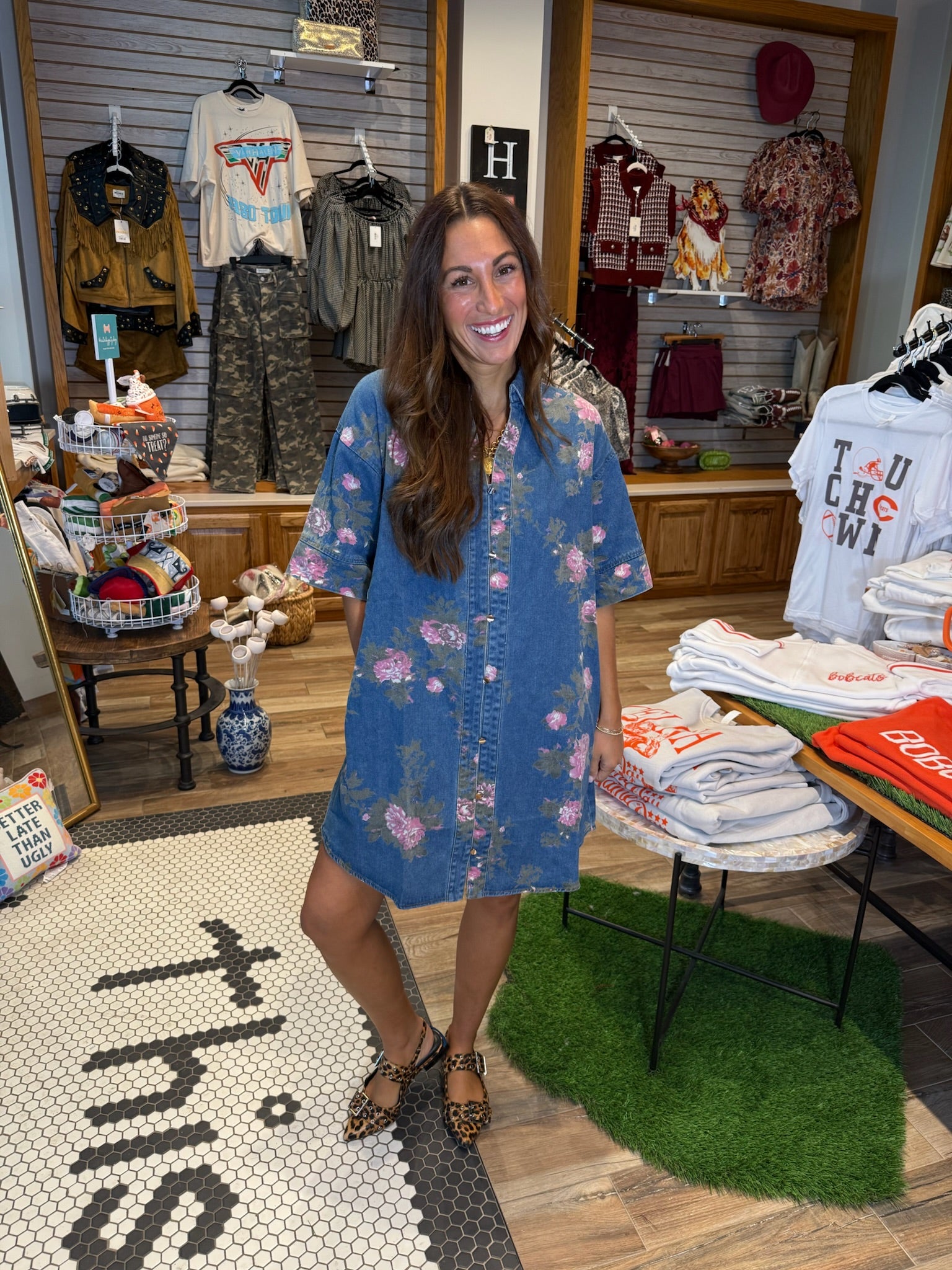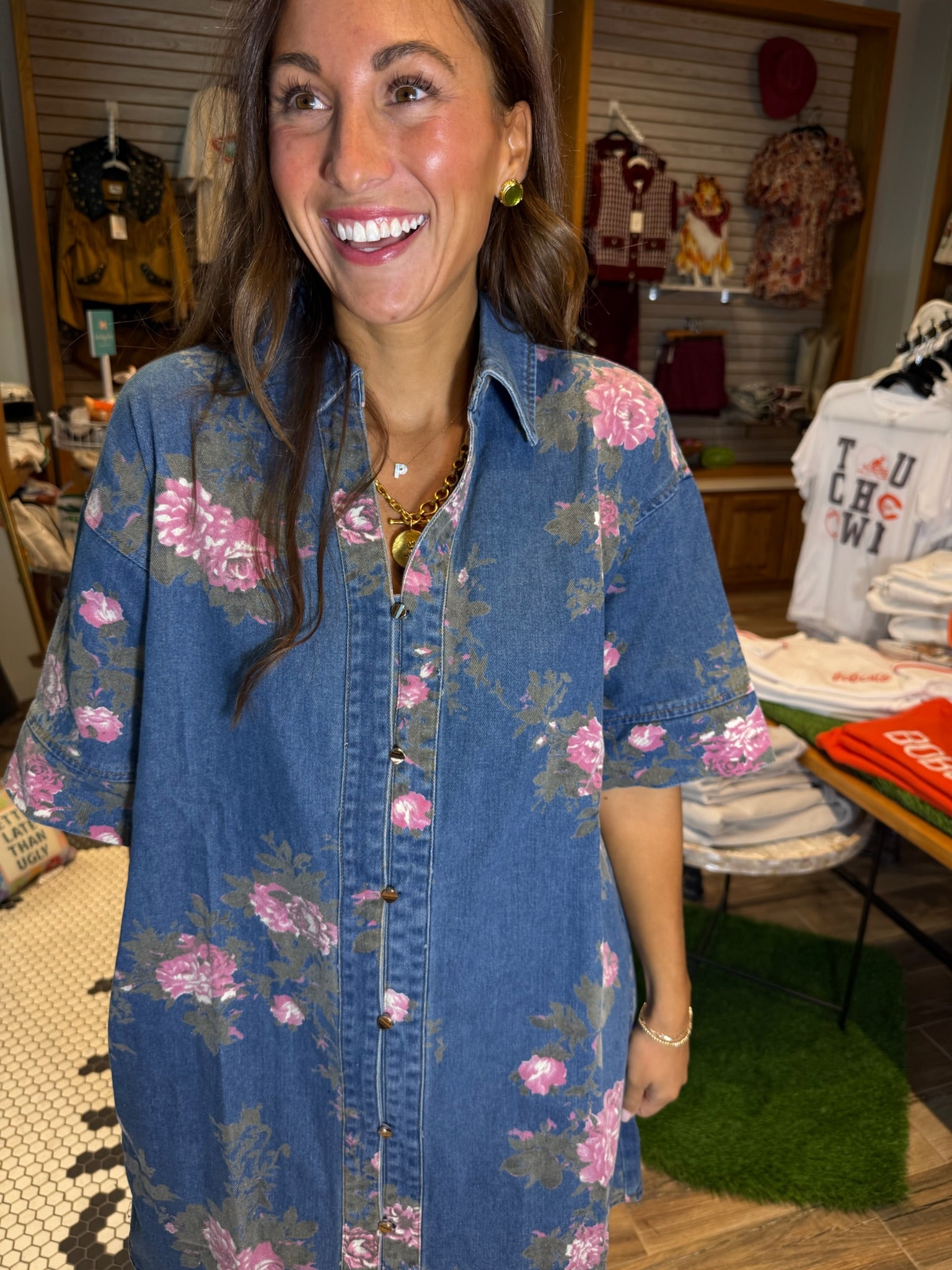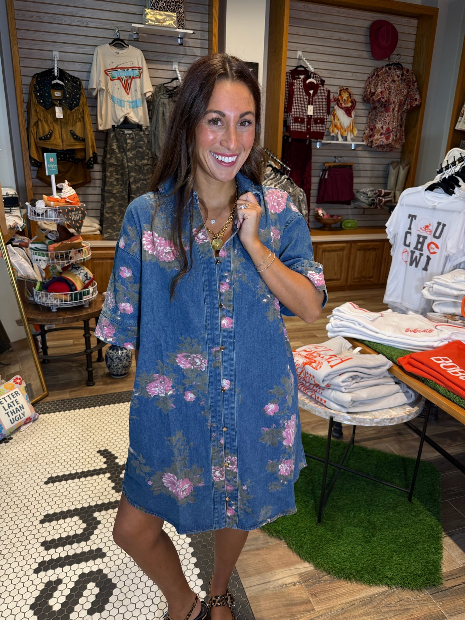 Floral print elbow-length sleeve shirt dress. Side pockets. Unlined. Woven. Non-sheer. Lightweight.