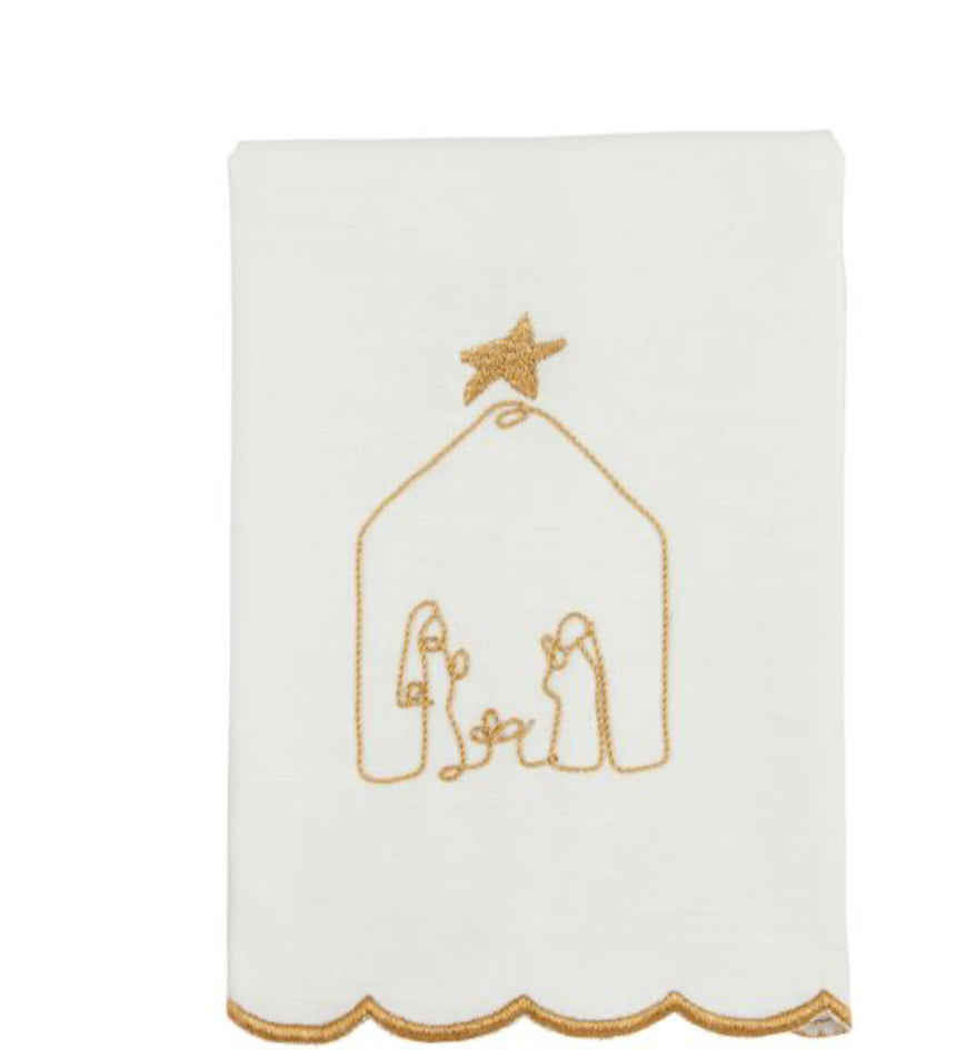 he Nativity Gold Scallop Towel is a beautifully crafted hand towel made from high-quality cotton. It features an elegant scallop edge design that adds a touch of sophistication to any bathroom or kitchen. The towel is embroidered with a stunning nativity scene, showcasing intricate details and vibrant colors. Measuring 21 inches in length and 14 inches in width, this towel is the perfect size for drying hands or adding a decorative element to your space. The soft and absorbent cotton material ensures that this towel is not only visually appealing but also functional. Whether you're looking to enhance your own home decor or searching for a thoughtful gift, the Nativity Gold Scallop Towel is a must-have item.