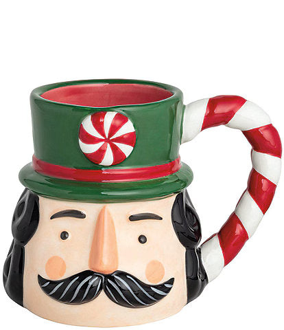 Green Nutcracker Handle Mug. This charming hand-painted ceramic mug features a delightful figural Christmas candy handle, adding a festive touch to your holiday gatherings. With a generous 13 oz. capacity, it's perfect for enjoying your favorite hot beverages, from coffee to cocoa. Crafted from high-quality dolomite, this mug is both durable and visually appealing, making it a wonderful addition to your seasonal kitchenware collection. The vibrant red color and intricate nutcracker design bring a whimsical and cheerful element to your table setting, making it an ideal gift for loved ones or a special treat for yourself during the holiday season.