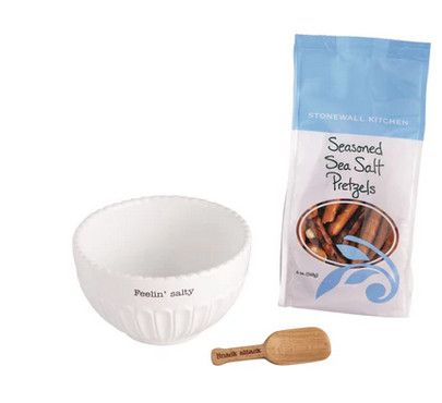 Textured ceramic snack bowl. Comes with engraved wood scoop and Stonewall Kitchen bag of pretzels.