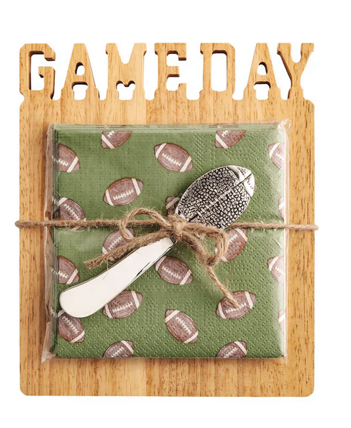 This fun 3-piece set features a cut-out wooden board perfect for game day snacks. It includes a pack of 12 paper napkins to keep things tidy and a stainless steel football-shaped spreader that adds a playful touch to your spread. Ideal for entertaining with style and a bit of sporty flair!