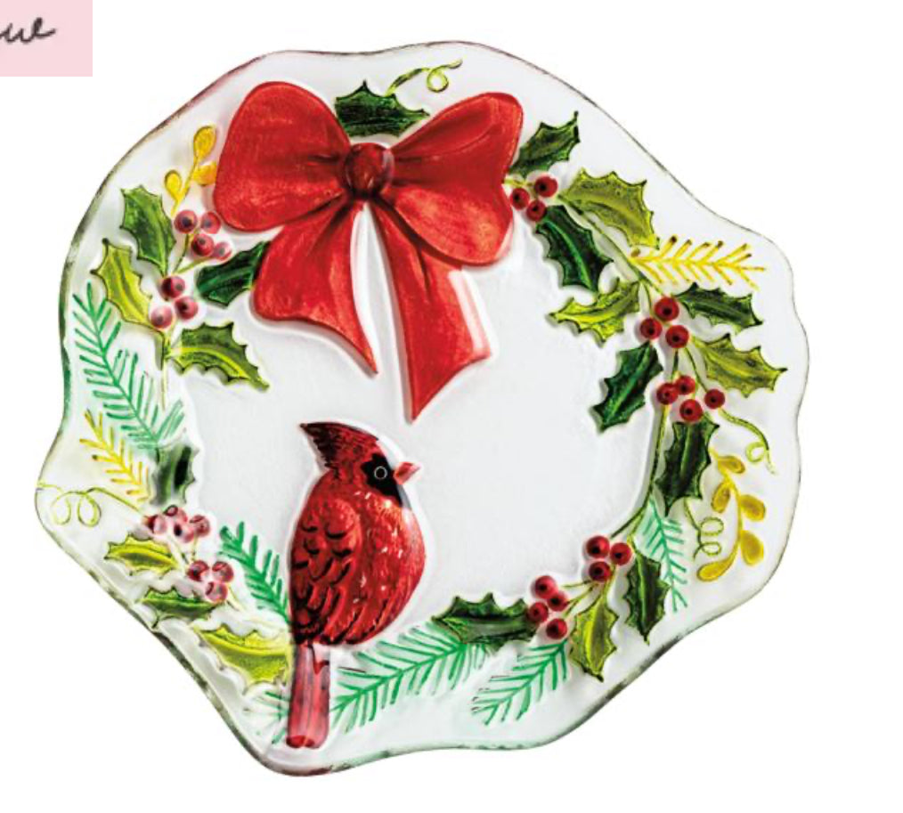 Fused Glass Wreath Plate. This exquisite hand-painted glass plate features a beautifully crafted wreath design, perfect for adding a touch of elegance to any table setting. With a generous 12-inch diameter, it serves as a stunning centerpiece or a functional serving dish for your favorite appetizers, desserts, or holiday treats. The vibrant colors and intricate details of the wreath pattern are sure to captivate your guests, making it an ideal choice for festive occasions or everyday use. Made from high-quality glass, this plate is both durable and stylish, ensuring it remains a cherished part of your home decor for years to come. Whether displayed on its own or used to enhance your dining experience, this Fused Glass Wreath Plate is a versatile and eye-catching addition to any collection.
