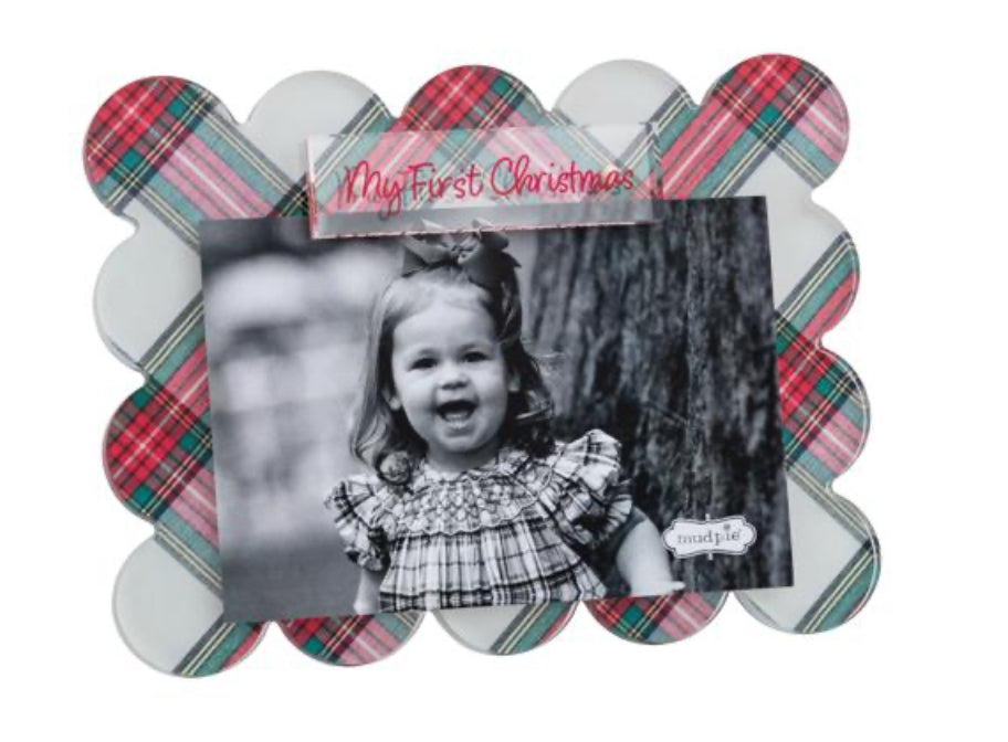 Celebrate the joy of your baby's first Christmas with this charming acrylic frame, designed to capture and display your precious memories. The magnetic tartan frame, adorned with a delightful scallop edge, adds a festive touch to your holiday decor. Its layered acrylic sentiment magnet securely holds a 4" x 6" photo, ensuring your cherished moments are beautifully showcased. The frame's easel back allows for easy placement on any tabletop or mantel, making it a perfect addition to your seasonal decorations. Measuring 6" x 8", this durable acrylic frame is a wonderful keepsake that will bring warmth and nostalgia to your home for years to come.