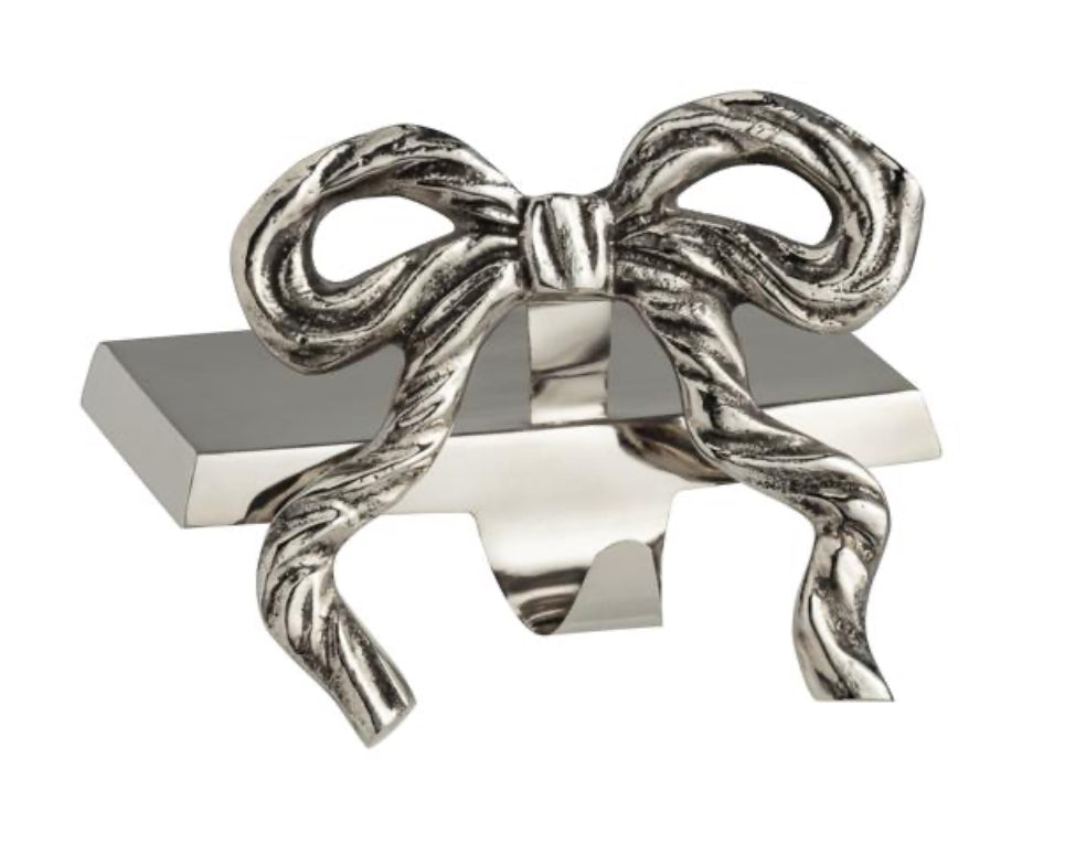 Elevate your holiday decor with this exquisite Metal Bow Stocking Holder, crafted from durable cast aluminum for a timeless and elegant look. The dimensional bow design adds a touch of sophistication, making it a perfect addition to your mantelpiece. Measuring 4 1/2" x 4", this stocking holder is not only a functional piece for hanging your festive stockings but also a charming decorative accent that complements any holiday theme. Its sturdy construction ensures it can securely hold even the fullest stockings, while the sleek metal finish enhances its visual appeal. Ideal for creating a warm and inviting atmosphere, this stocking holder is a must-have for your seasonal celebrations.