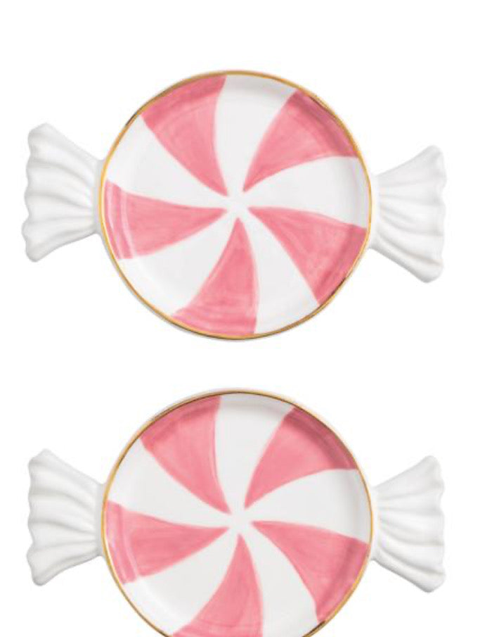 Add a touch of festive charm to your table setting with this delightful set of two Green Candy Tidbit Plates. Each plate is crafted in the shape of a peppermint candy, bringing a whimsical and cheerful vibe to any occasion. The plates are made from high-quality dolomite, ensuring durability and a smooth finish. Hand-painted gold rims add an elegant touch, making these plates perfect for both casual gatherings and more formal holiday celebrations. Measuring 4 inches by 6 1/4 inches, they are ideal for serving small treats, appetizers, or desserts. Whether you're hosting a holiday party or simply enjoying a cozy evening at home, these tidbit plates are sure to impress your guests and enhance your dining experience.