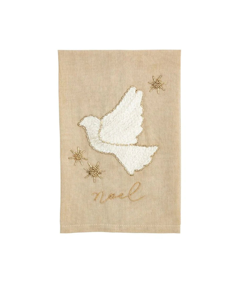 Elevate your bathroom decor with the Dove Embroidered Towel, a luxurious cotton hand towel that combines elegance and functionality. This exquisite towel features intricate gold lurex embroidery and a beautifully beaded icon, adding a touch of sophistication to any setting. Measuring 21" x 14", it is perfectly sized for versatile use, whether in the guest bathroom or as a decorative accent. Crafted from a high-quality blend of 82% cotton and 18% polyester, this towel offers a soft, absorbent texture while ensuring durability and easy maintenance. Transform your everyday routine into a spa-like experience with this stunning addition to your home.