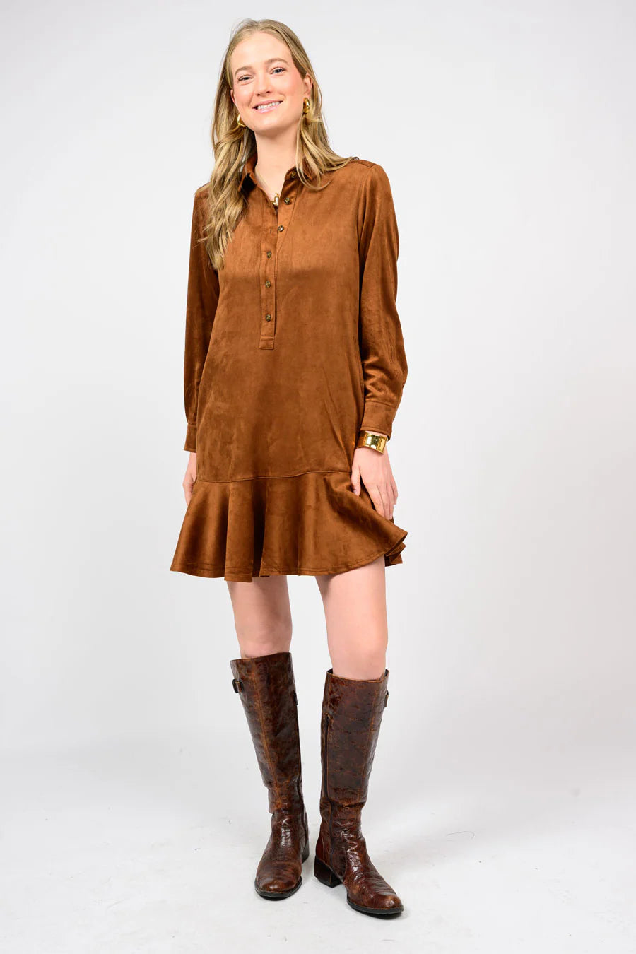 The Ivy Jane Suede Swing Shirtdress features a luxurious suede fabric and a flattering swing silhouette. Its versatile shirtdress style in a beautiful chestnut color makes it a timeless wardrobe piece.