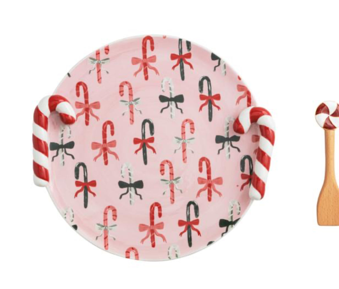 Celebrate the festive season with our charming Christmas Candy Cane Plate Set, perfect for adding a touch of holiday cheer to your gatherings. This delightful 2-piece set includes a beautifully patterned ceramic cookie plate, featuring intricately hand-painted candy cane designs that bring a whimsical flair to your table setting. The plate is crafted with layered ceramic handles, ensuring both style and functionality. Accompanying the plate is a wooden spatula, designed with an enamel-coated peppermint handle, making it a delightful addition to your holiday kitchenware. The plate measures an impressive 11 3/4" in diameter, providing ample space for your favorite holiday treats, while the spatula, at 5 1/2", is perfect for serving. Made from high-quality dolomite, this set is not only visually appealing but also durable, ensuring it will be a cherished part of your holiday traditions for years to come.