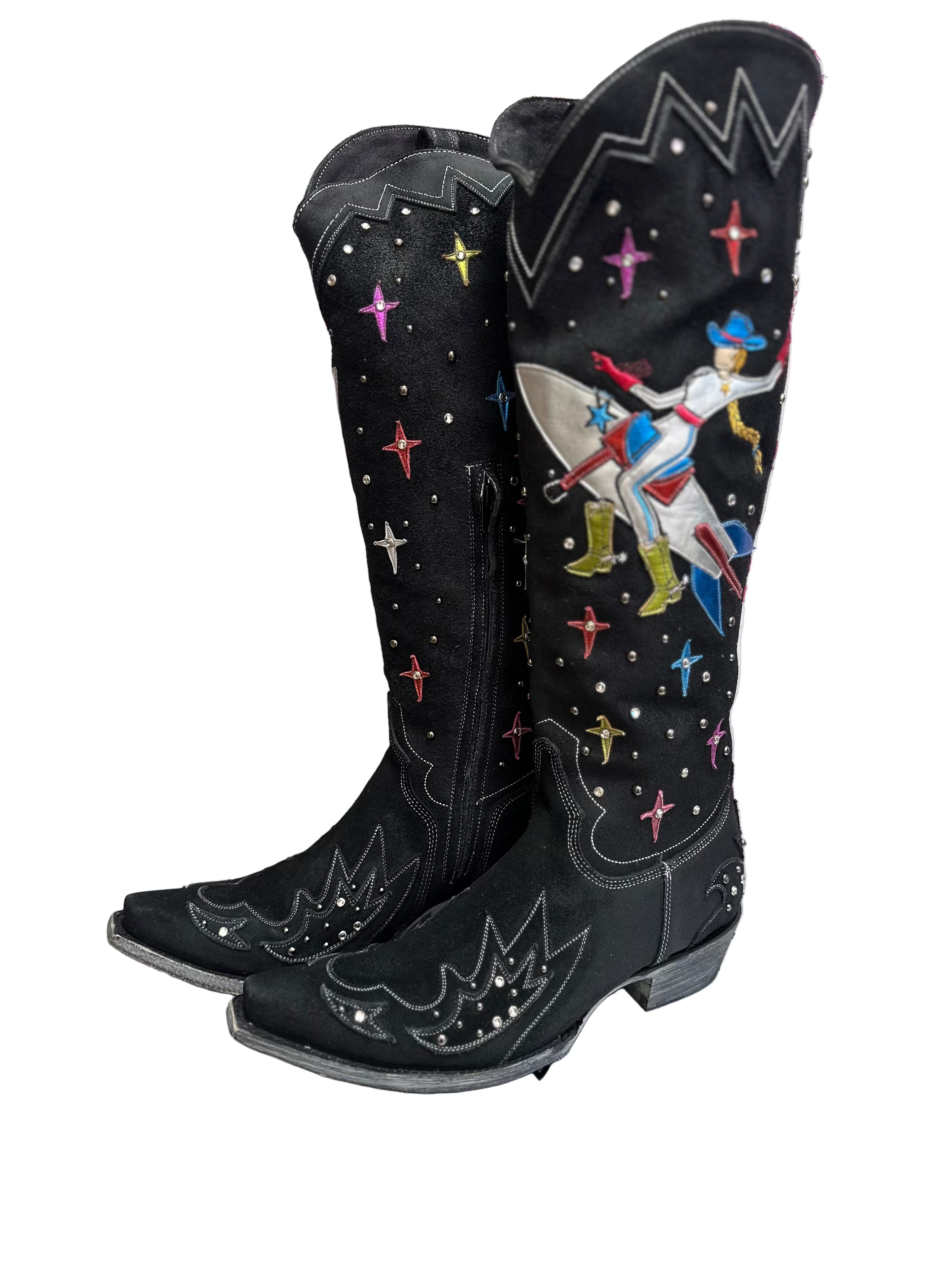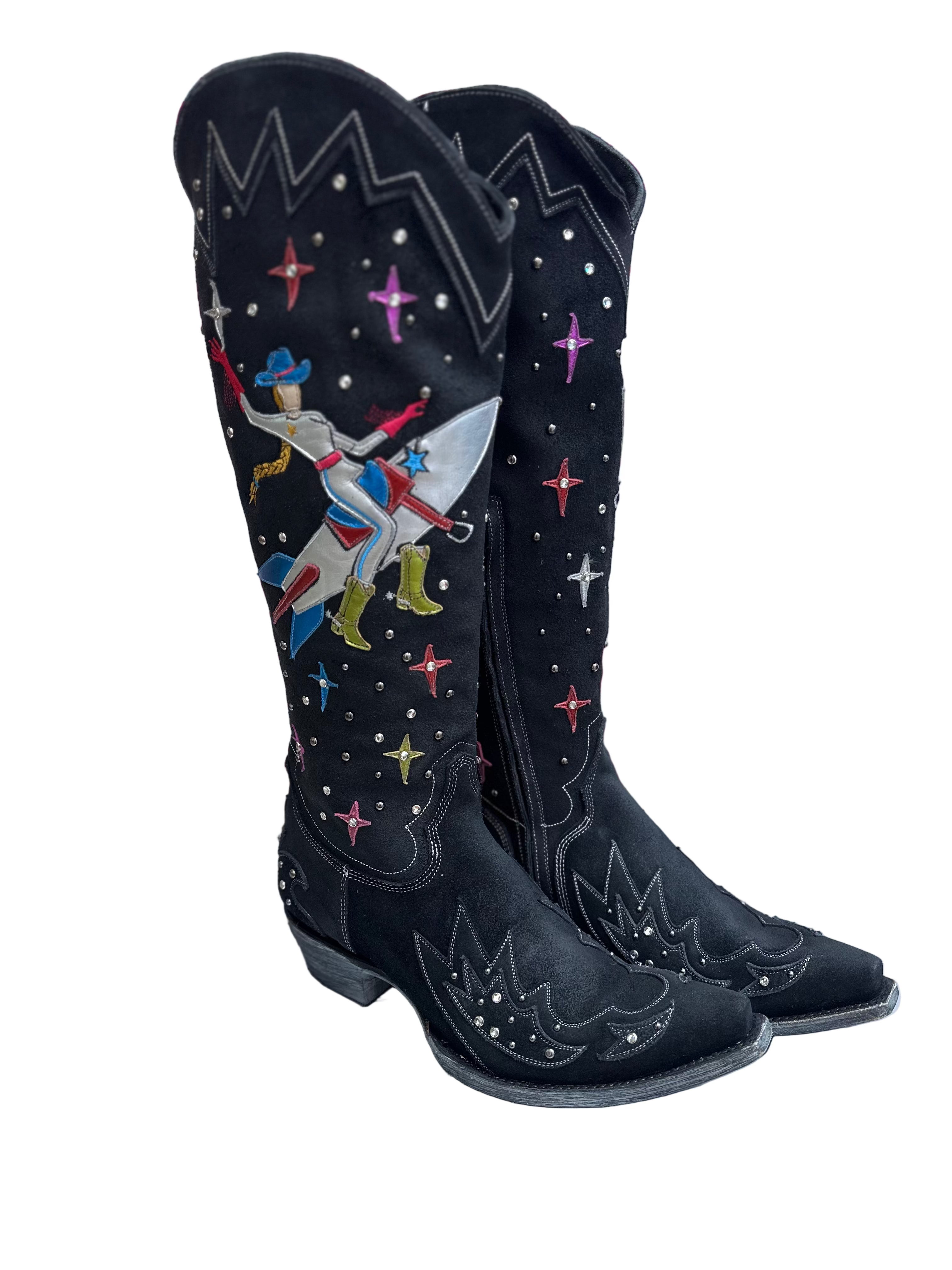 T-minus 10 seconds... Go for launch... We have liftoff! It's the Celestial Boots by Old Gringo - blasting in on the country western fashion scene in an out of this world way! Made with soft, stunning black suede, she stands 18 inches tall - featuring convenient interior zippers - finished with an easy walking heel and comfortable pointed snip toe. We are all starry eyed over the playful imagery - an astronaut cowgirl riding a rocket ship through space - crystals and studs sparkling, lighting up the night sky. All systems are go - we're living in a Cosmic Cowgirl's Universe - in the Celestial boots!