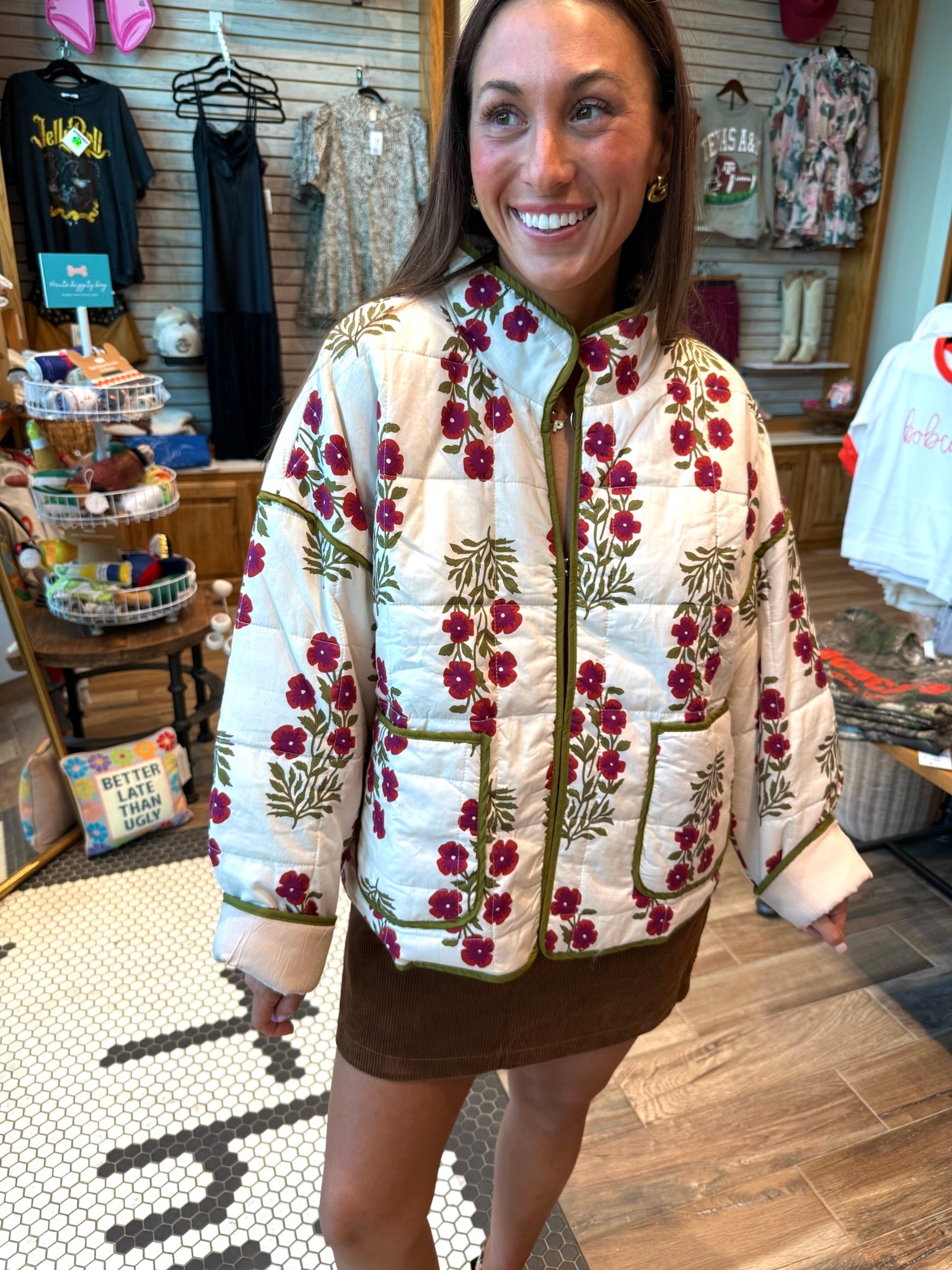 The Scottie jacket is a lightweight quilted material perfect for keeping cute and trendy as temperatures cool off! This jacket has a slightly oversized fit!