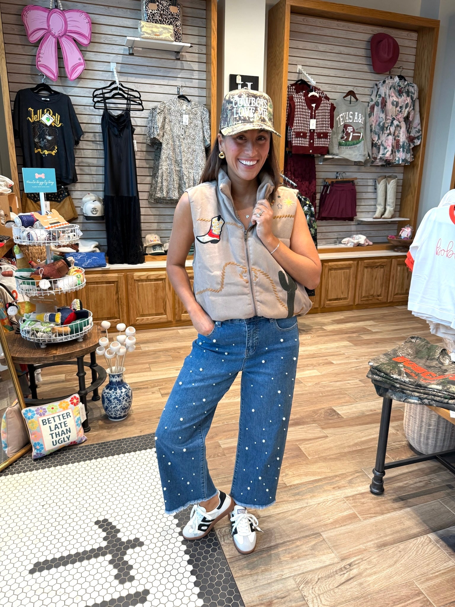 The Willa vest is a classic puffer vest with a western embroidery flair!