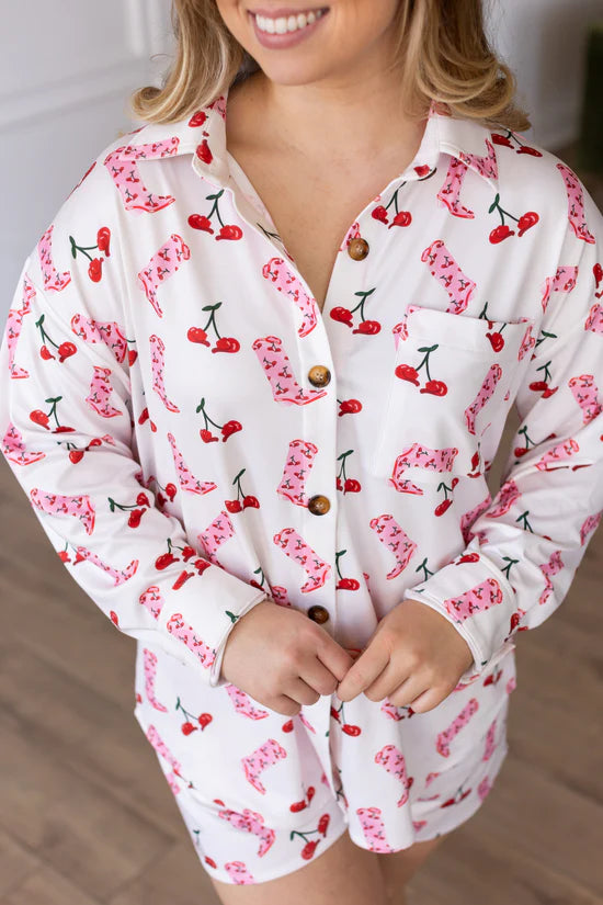 This set features a button-front shirt and a matching elastic-band short with pockets and button detail on the front.