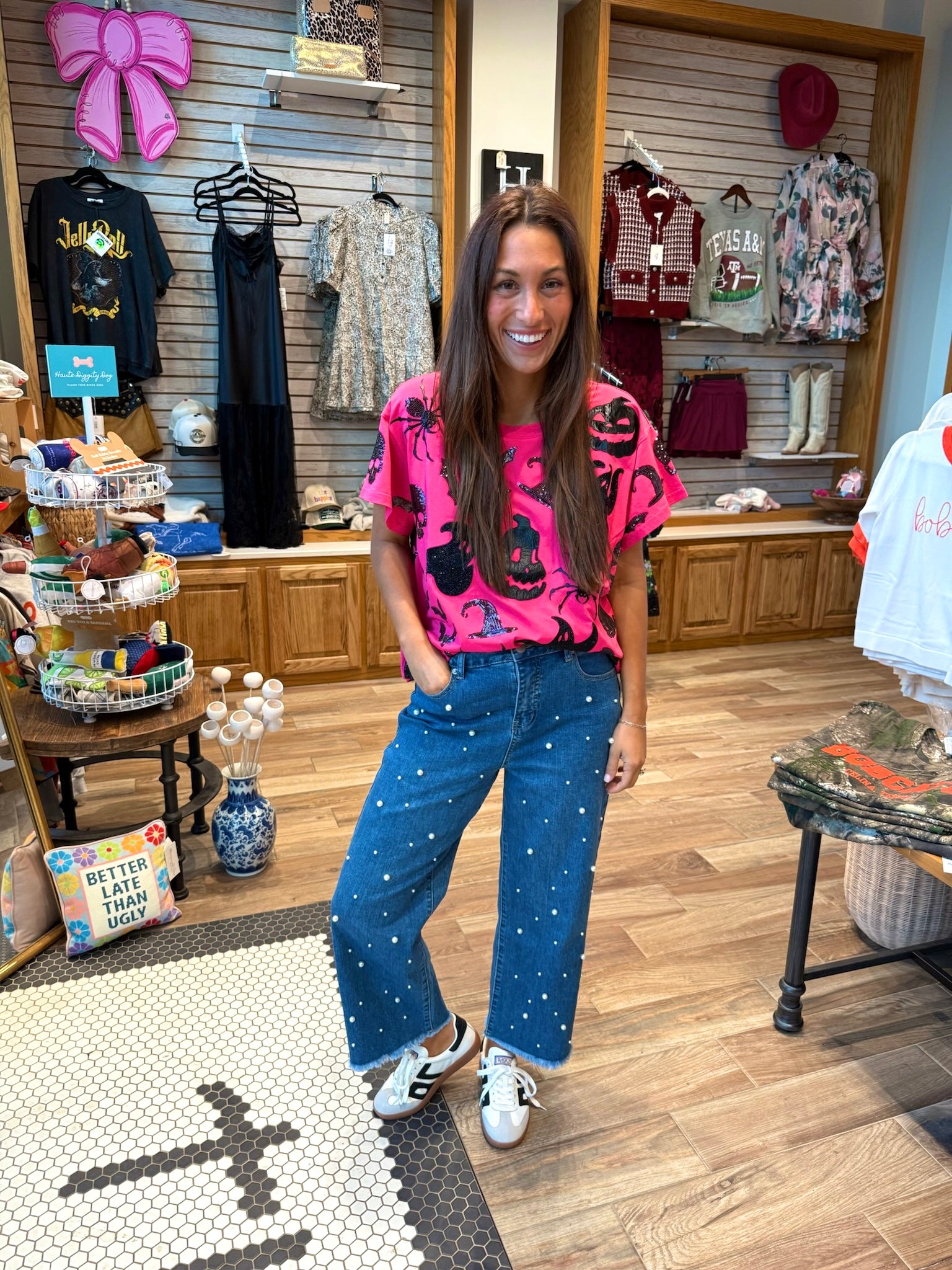 Celebrate spooky season in style with the Hot Pink & Black Halloween Icon Tee! Featuring bold pink and black Halloween-themed icons, this tee adds a fun and festive twist to your wardrobe. Perfect for party-goers or anyone wanting to show off their Halloween spirit with a playful edge. Comfortable and eye-catching, it’s your go-to shirt for all things spooky and stylish.