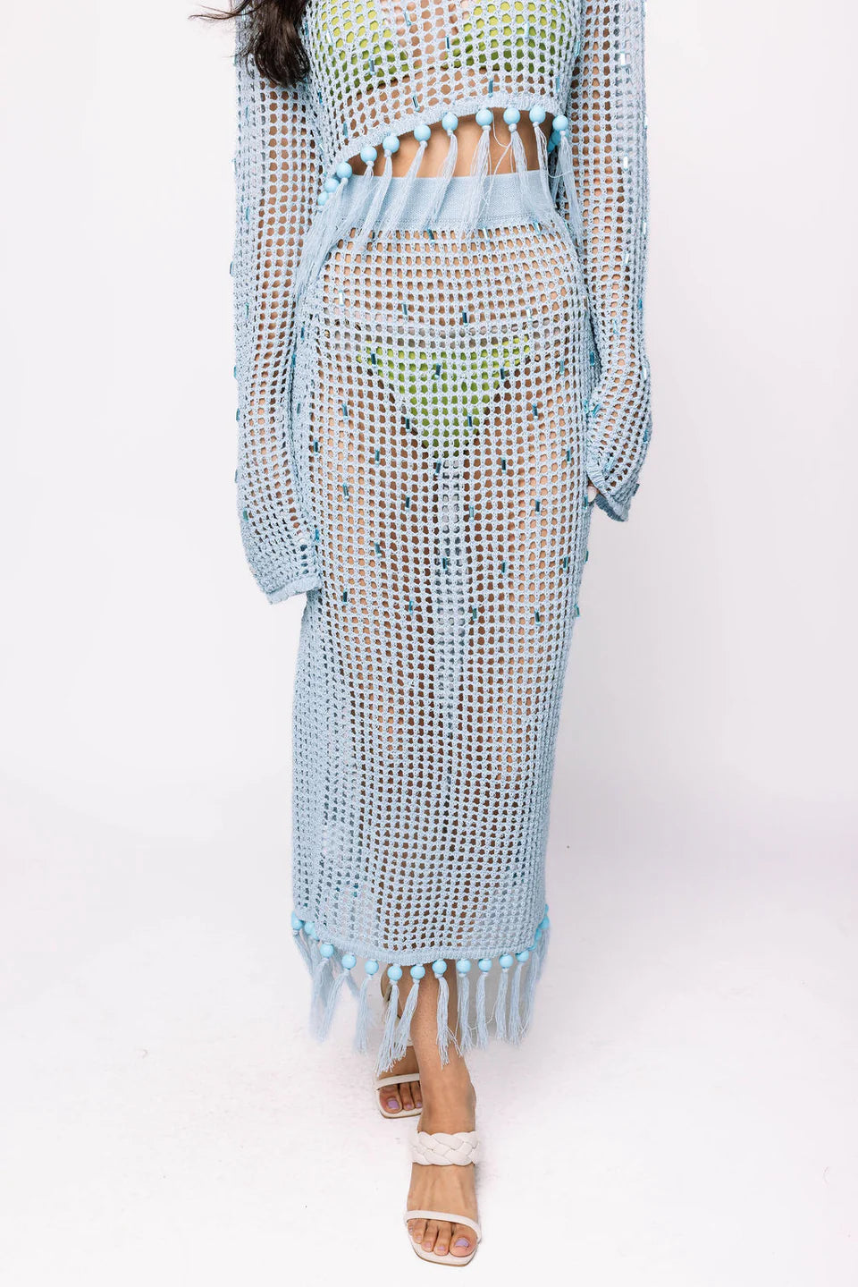 Elevate your beach or poolside look with this Light Blue Mesh Fringe Coverup Midi Skirt. Its airy mesh fabric and playful fringe detailing offer a stylish way to stay cool and comfortable. Perfect for layering over your favorite swimwear, this skirt adds movement and a touch of effortless glamour to your summer wardrobe.