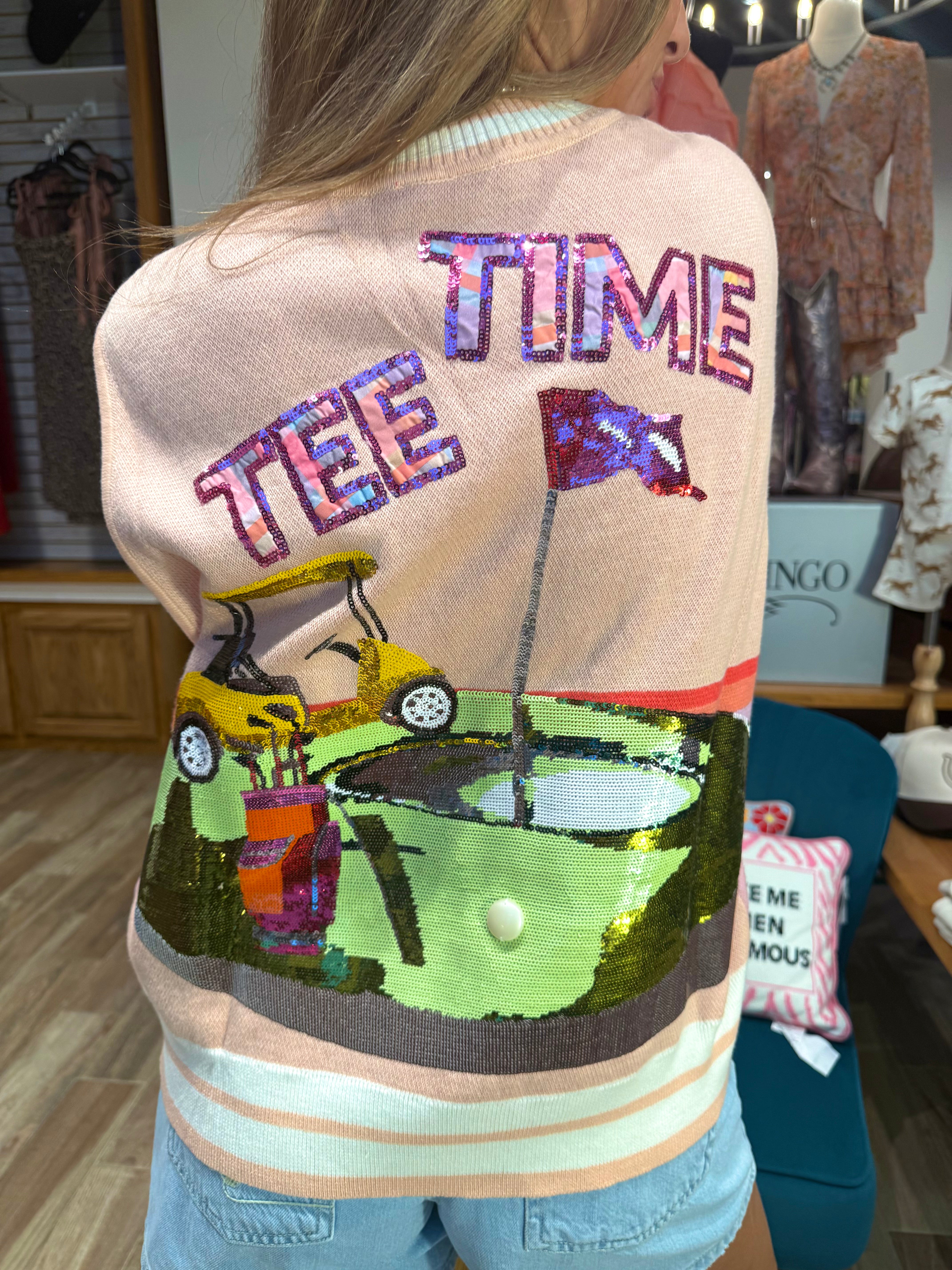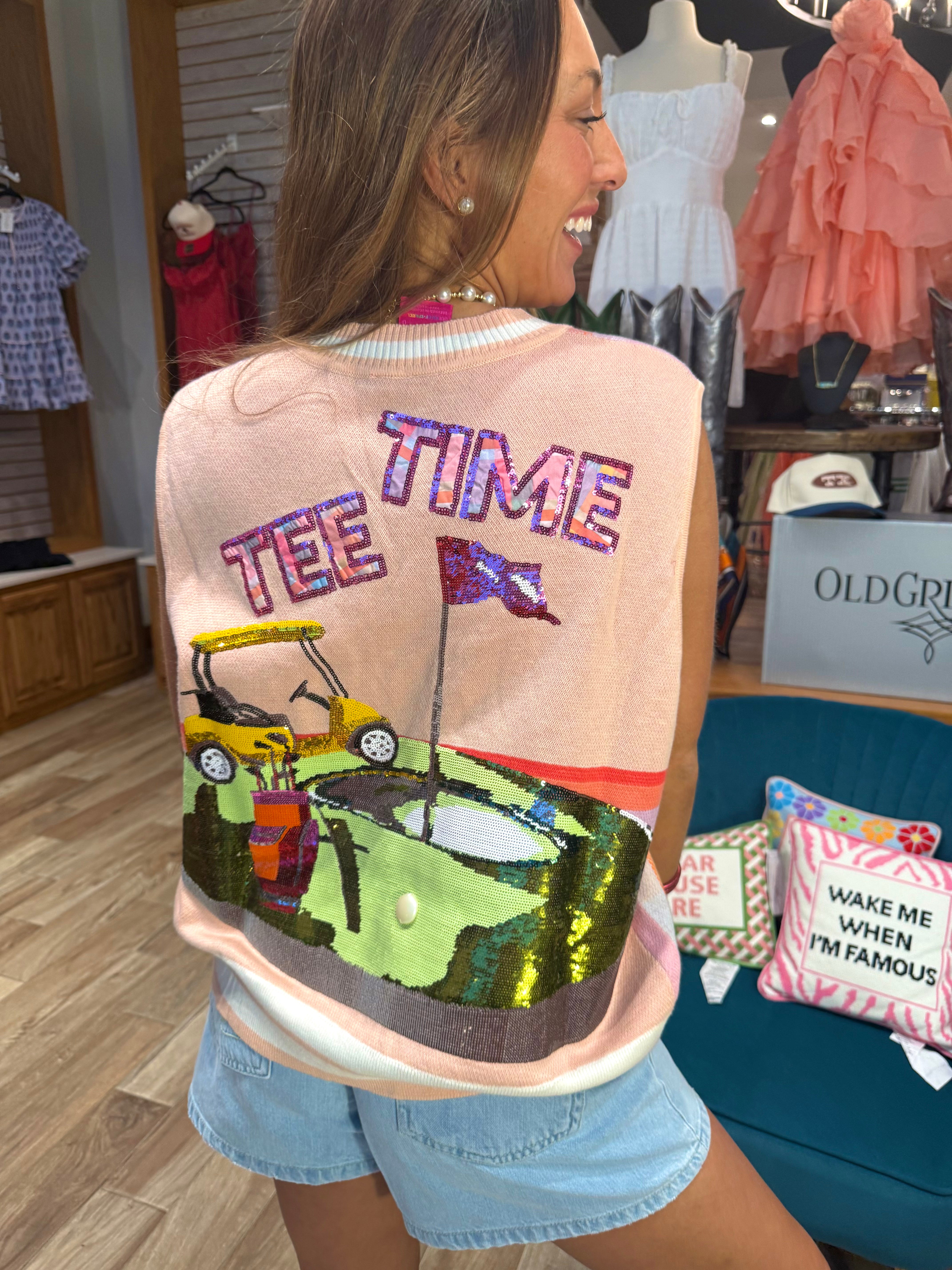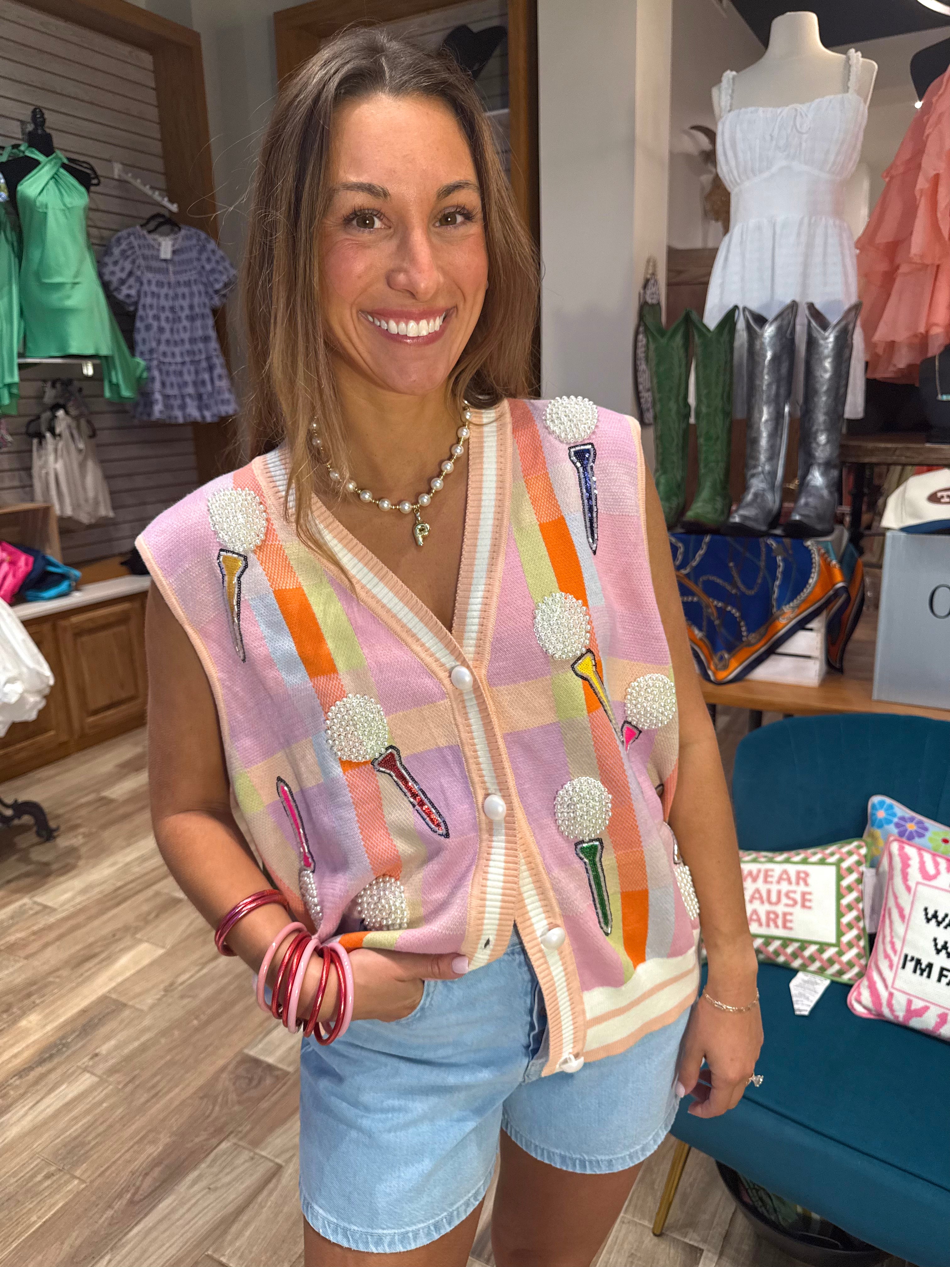 Light pink sweater best embellished with golf tees and beaded golf balls in the front with a golf course motif on the back and sequin golf ball. has an oversized fit.