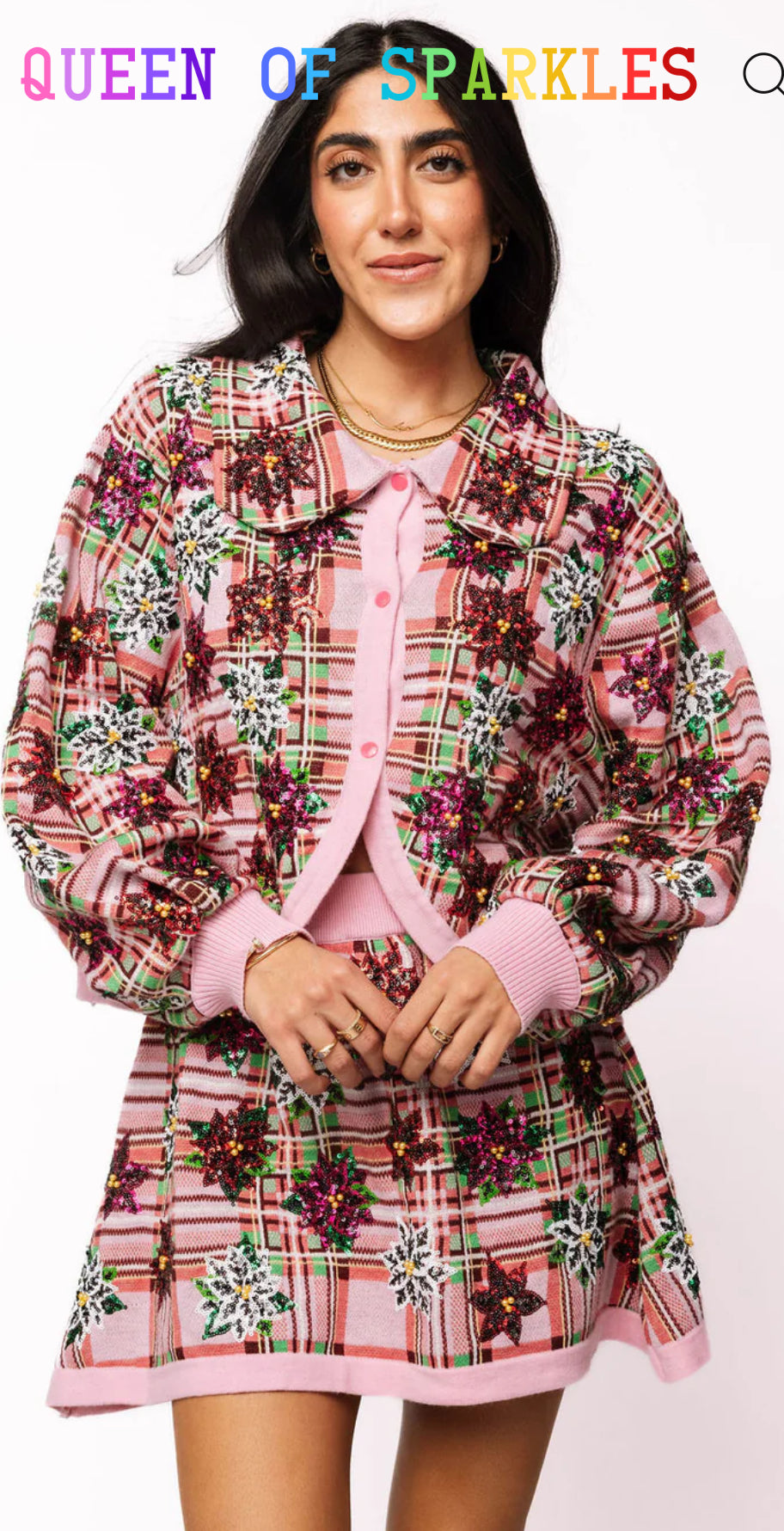 Bring festive fun to your wardrobe with this Pink Plaid Poinsettia Skirt. Featuring a charming jeweled poinsettia design, it adds a sparkling touch to your holiday style. Perfectly paired with the matching cardigan, this playful set keeps you cozy and stylish for all your seasonal celebrations.