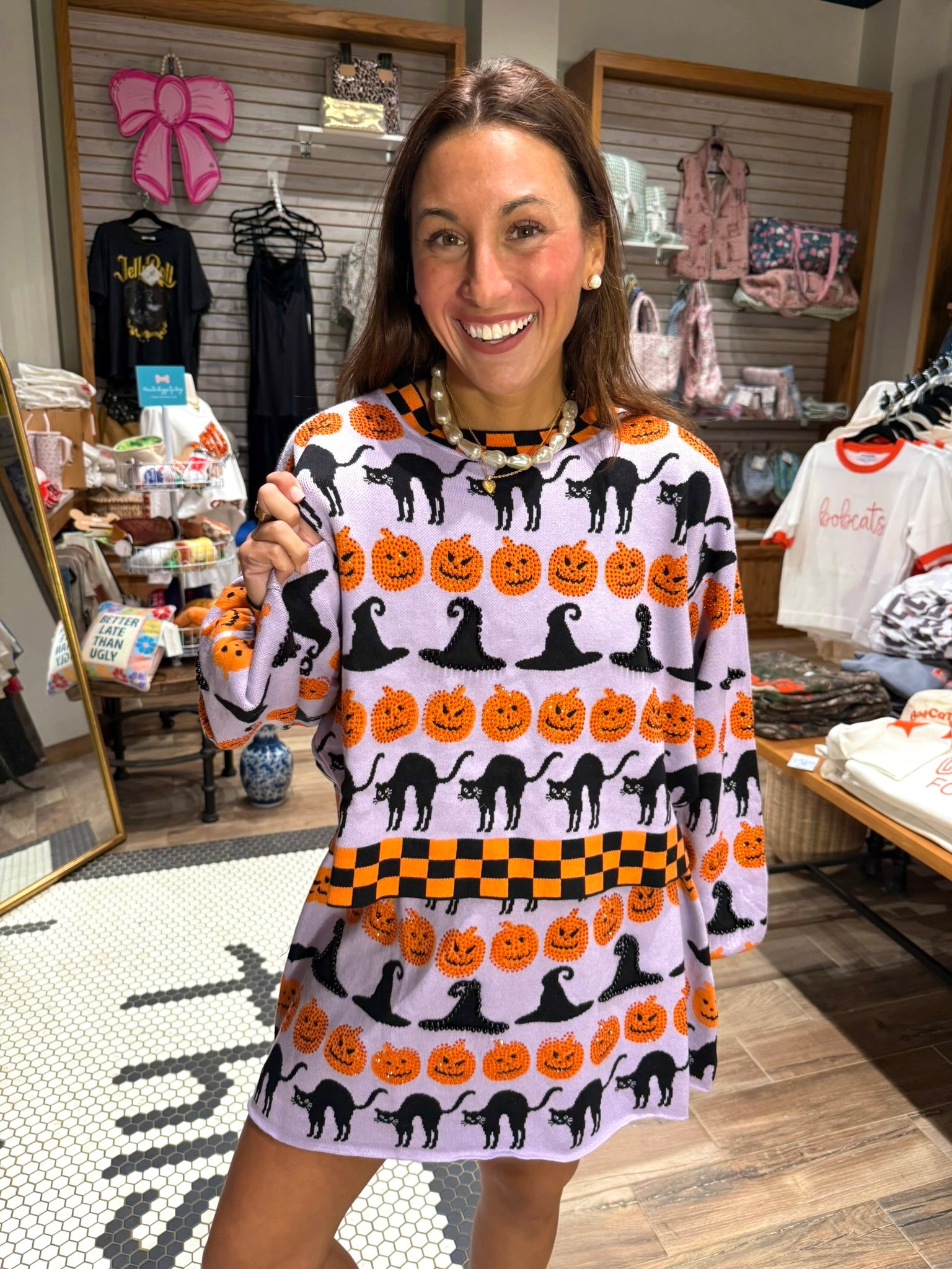 Get spooky in style with this Lavender, Black & Orange Checker Trim Halloween Icon Sweater! The playful mix of colors and checker trim brings a fun twist to your seasonal wardrobe, while cozy fabric keeps you warm during chilly autumn nights. Perfect for haunted house visits or pumpkin patch adventures, this sweater adds a cheerful Halloween vibe wherever you go.