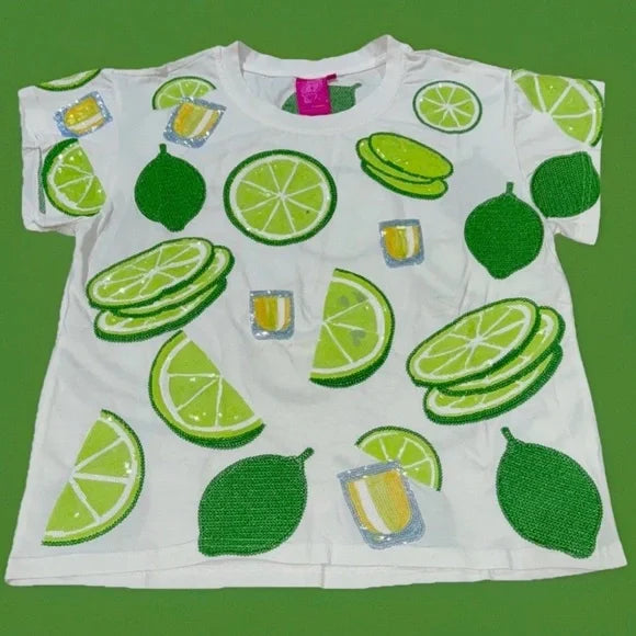 This Queen Of Sparkles tee is a must-have for any fashion-forward woman! The sequined lime and tequila shots add a fun and flirty touch to the relaxed fit, making it perfect for any occasion. The short sleeves and round neckline provide a comfortable and classic look. Whether you're dressing up or down, this tee is sure to make a statement.