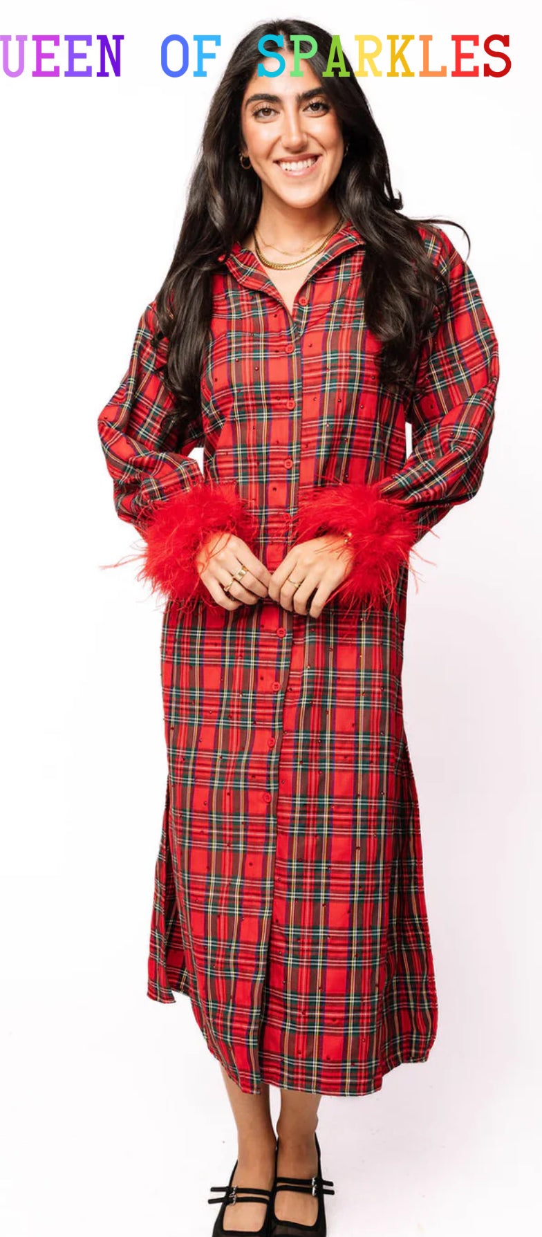This red and green plaid midi dress brings fun to your wardrobe with its playful feather sleeve cuffs and oversized, flowy fit. The button-up front adds a classic touch, while the relaxed silhouette keeps you comfortable and effortlessly stylish all day long. Perfect for cozy days with a spark of flair!