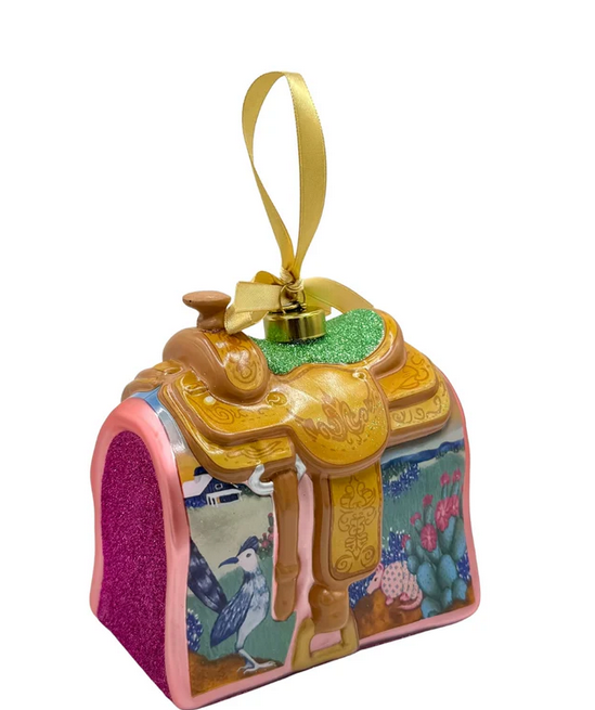 The saddle is intricately detailed with golden accents, and the blanket showcases a picturesque scene of blooming flowers, cacti, roadrunner, and an armadillo. Whether you hang it on your Christmas tree or display it as a keepsake, this Texas-themed ornament is sure to become a treasured part of your holiday traditions.