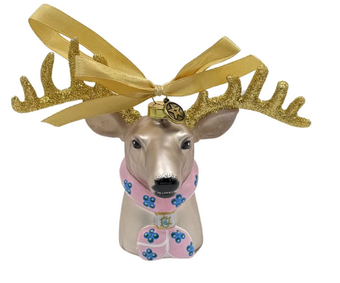 Add a bold and stylish touch of Texas wilderness to your holiday décor with this Trophy Whitetail Deer Hand-Blown Glass Ornament, featuring a charming twist—a pink and turquoise bandana tied proudly around its neck. This beautifully crafted ornament captures the rugged elegance of the iconic Texas whitetail deer with exquisite detail, from its majestic antlers to its glossy finish.