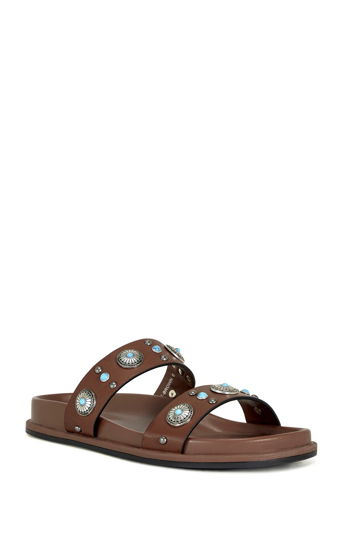 These black faux leather flat sandals feature a comfortable open toe design with two foot straps adorned with turquoise and silver studs, adding a Western bohemian twist to any summer look.
