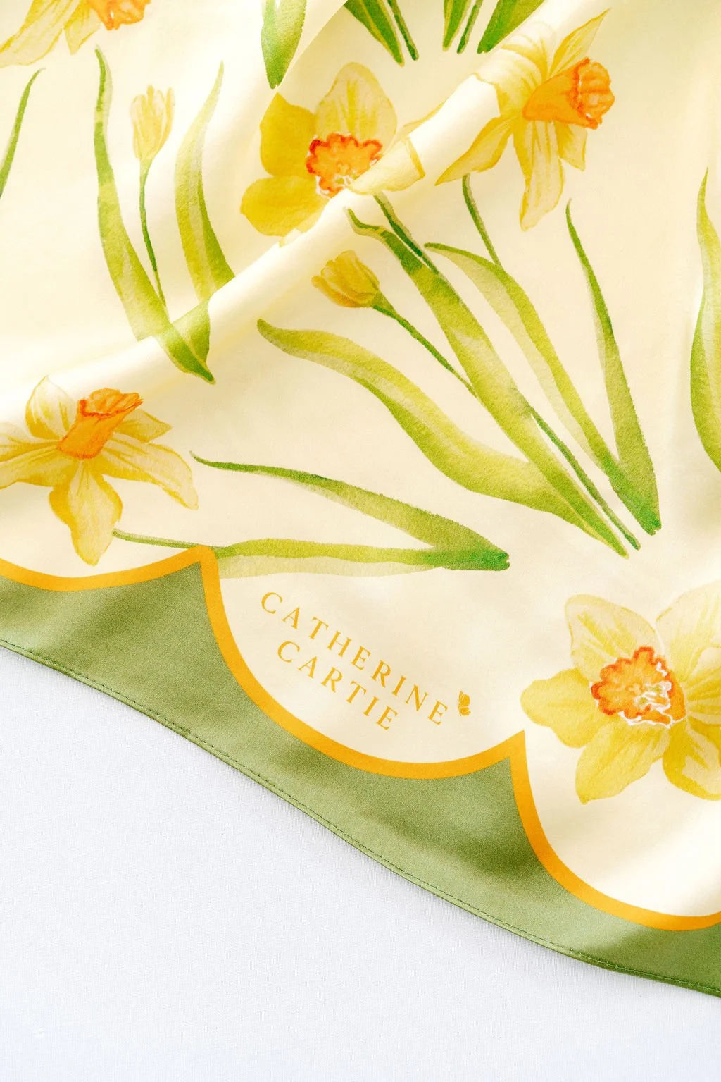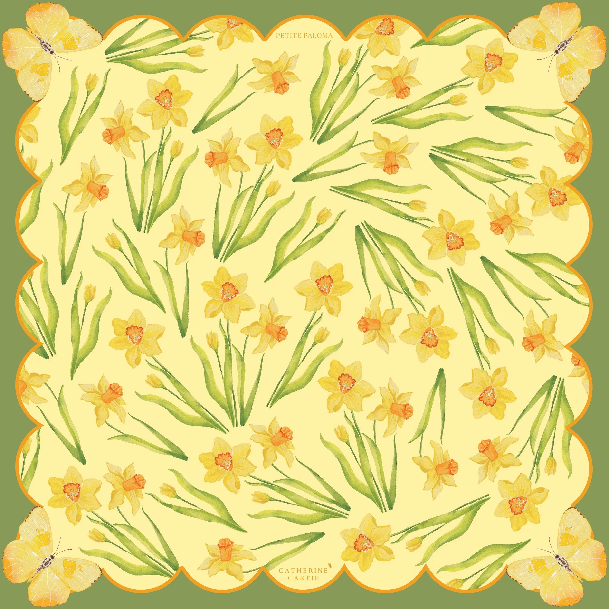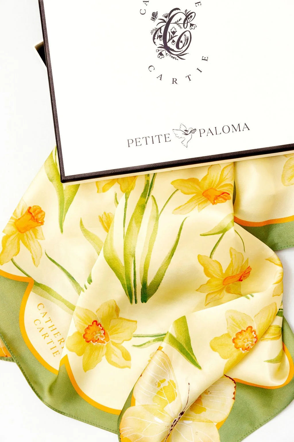 This bright, happy daffodil scarf is part of a collaboration with Petite Paloma, and perfectly goes with the Maes cowgirl boots. Featuring hand painted daffodils and yellow butterflies, this special scarf will lift your spirits all year round.