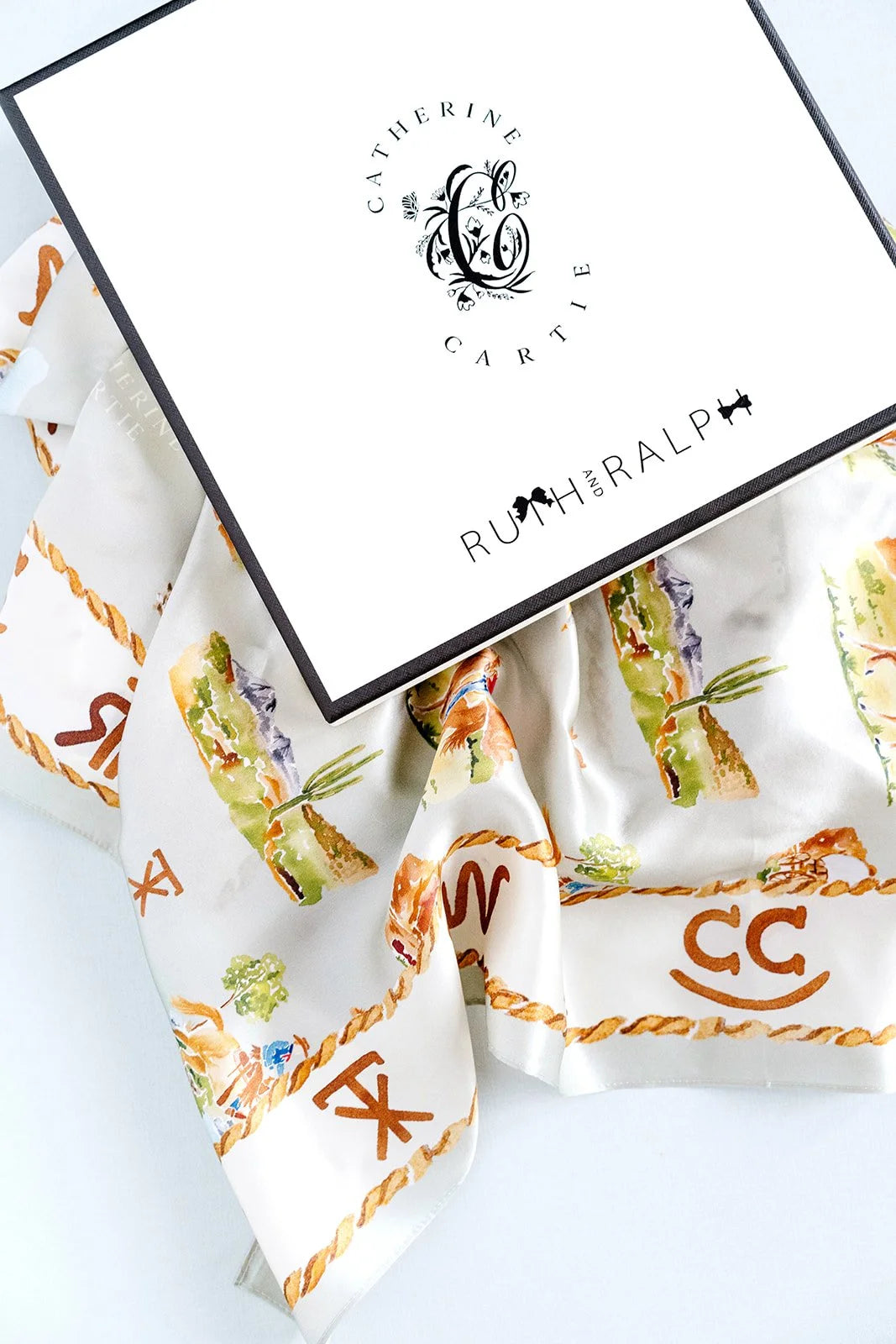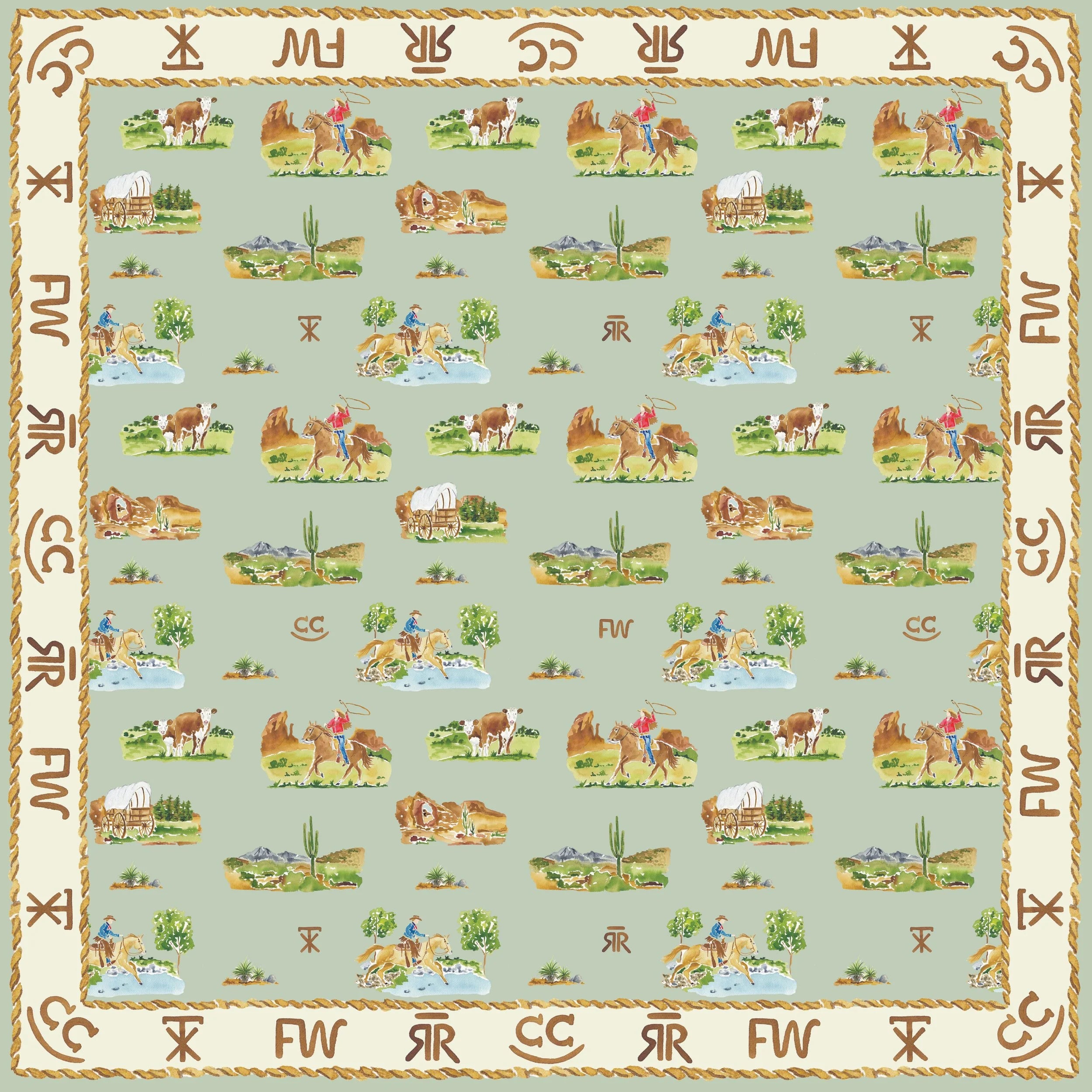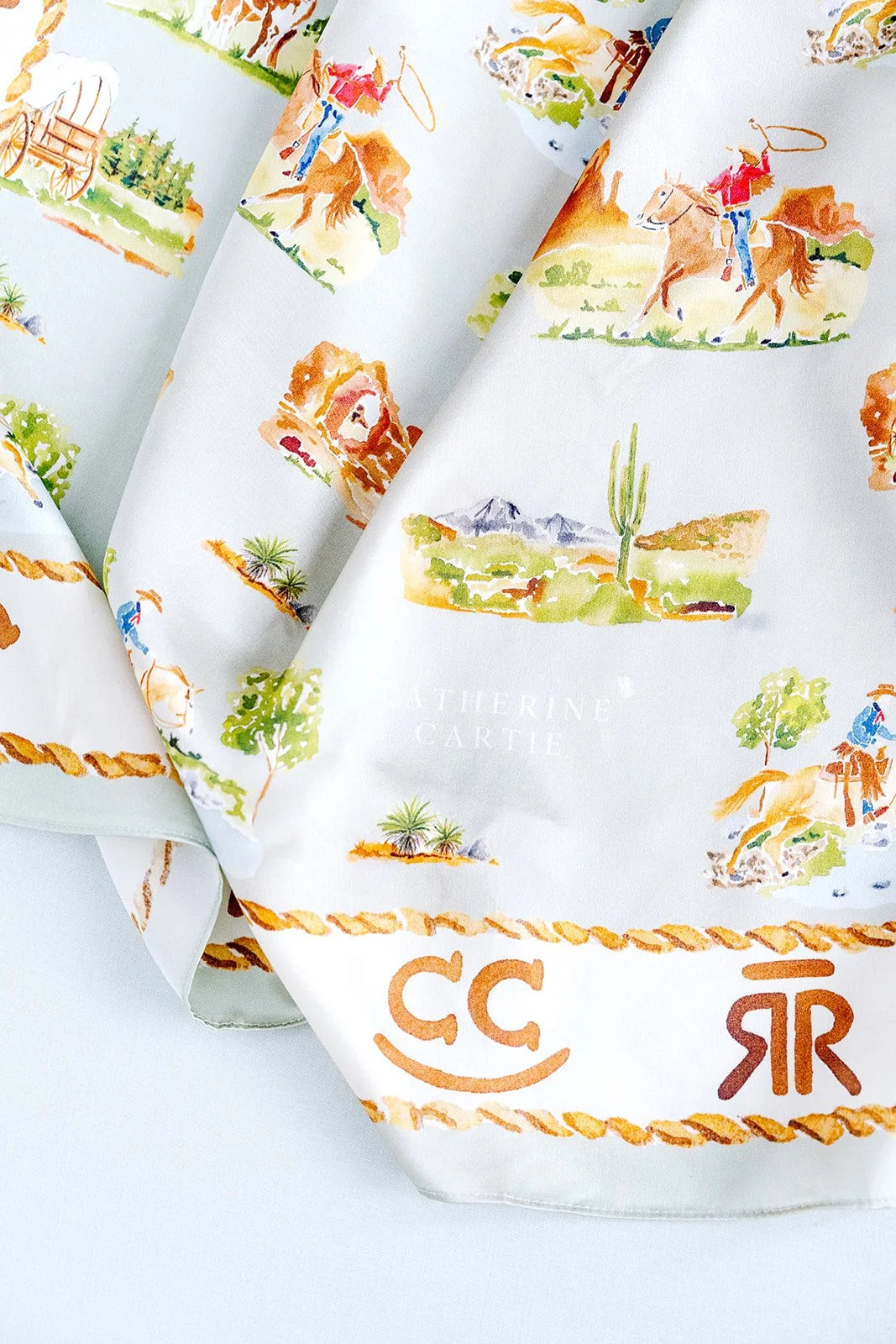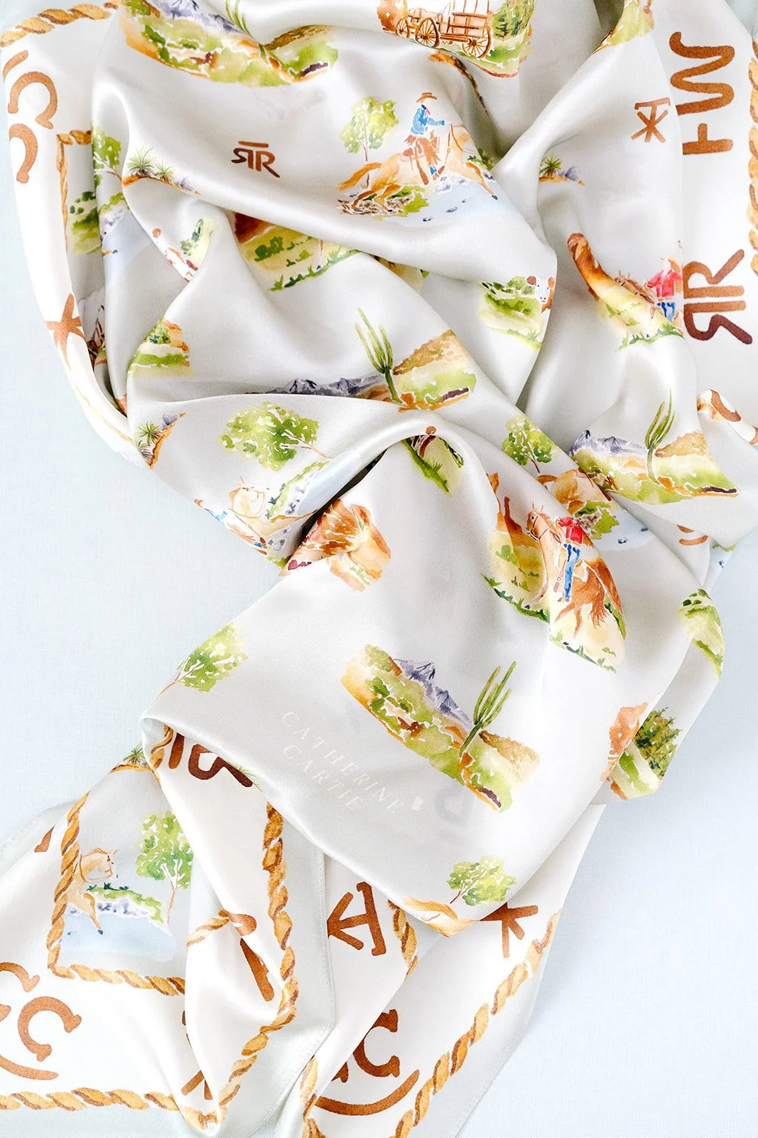 The Western Toile scarf was designed with illustrations from our rodeo collaboration with Ruth and Ralph. Featuring western landscapes and riders and horses in action, it’ll take you on a western adventure out on the open plains. Perfect to wear to the rodeo and everyday, or framed in your home for some western flair.