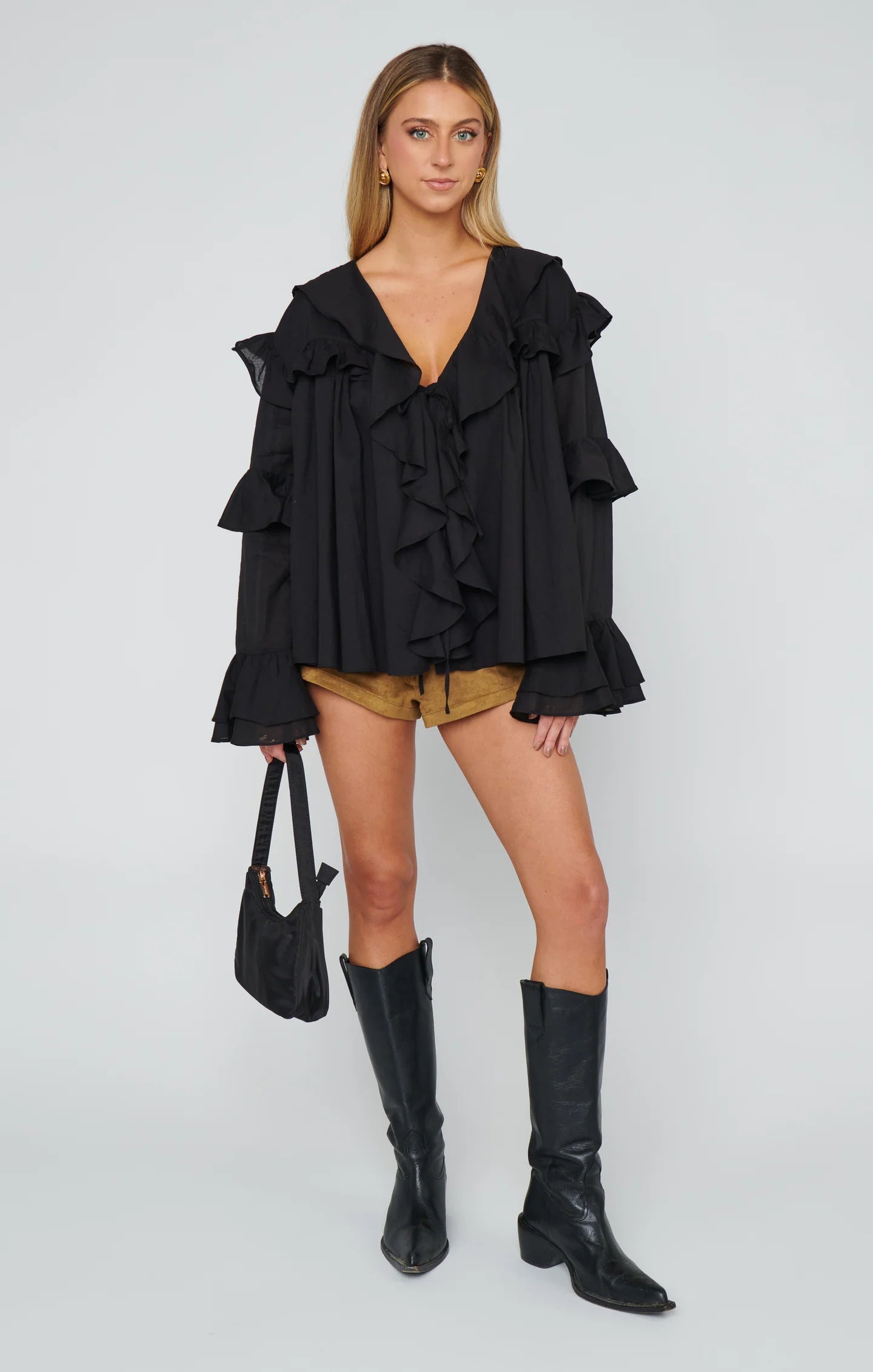 The Joss Ruffle Top is your new boho go-to! With a floaty oversized fit and billowy bell sleeves, it's made for easy days. With soft ruffle trims and a breezy flyaway hem, it’s equal parts femme and relaxed. Wear it loose with mini shorts when it’s hot out or tuck it into high-waisted denim as temps cool down.
