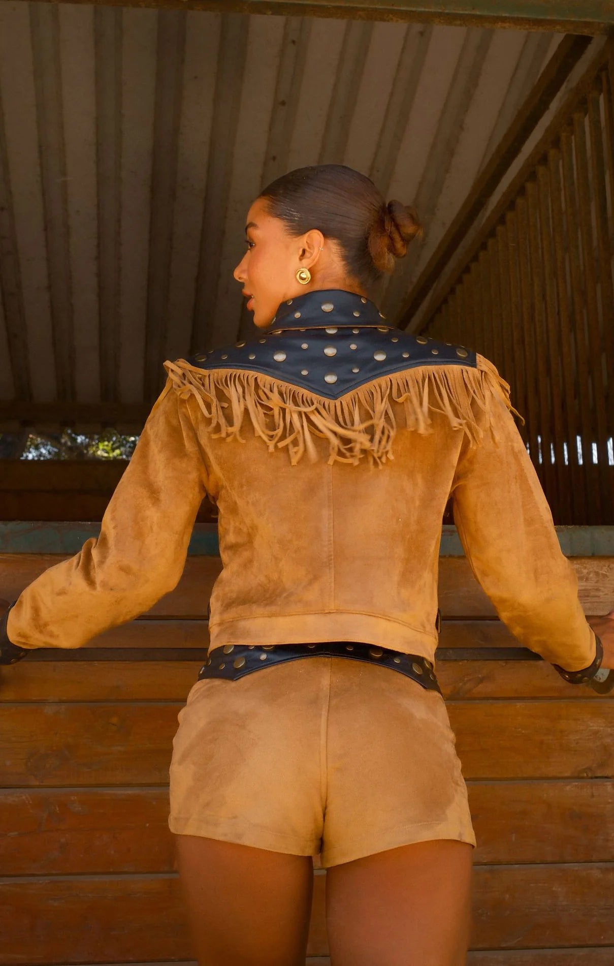 Saddle up in the Wilson Shorts! Soft faux suede and a sleek micro silhouette come together with gold studs for a perfect touch of western flair. Wear them solo or team up with the matching Wilson Jacket for a rodeo-ready look!
