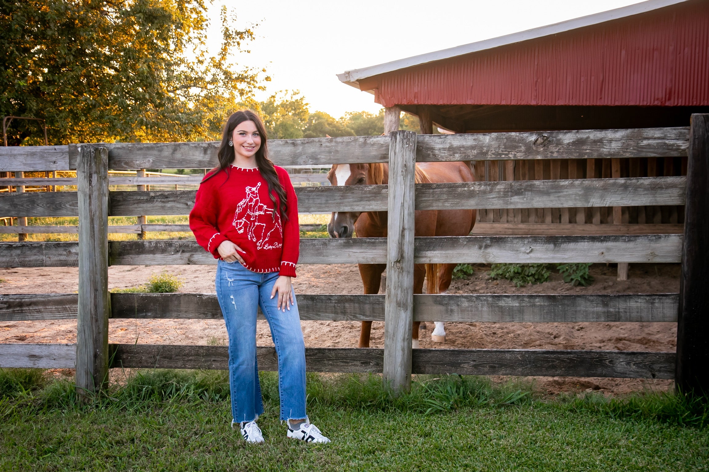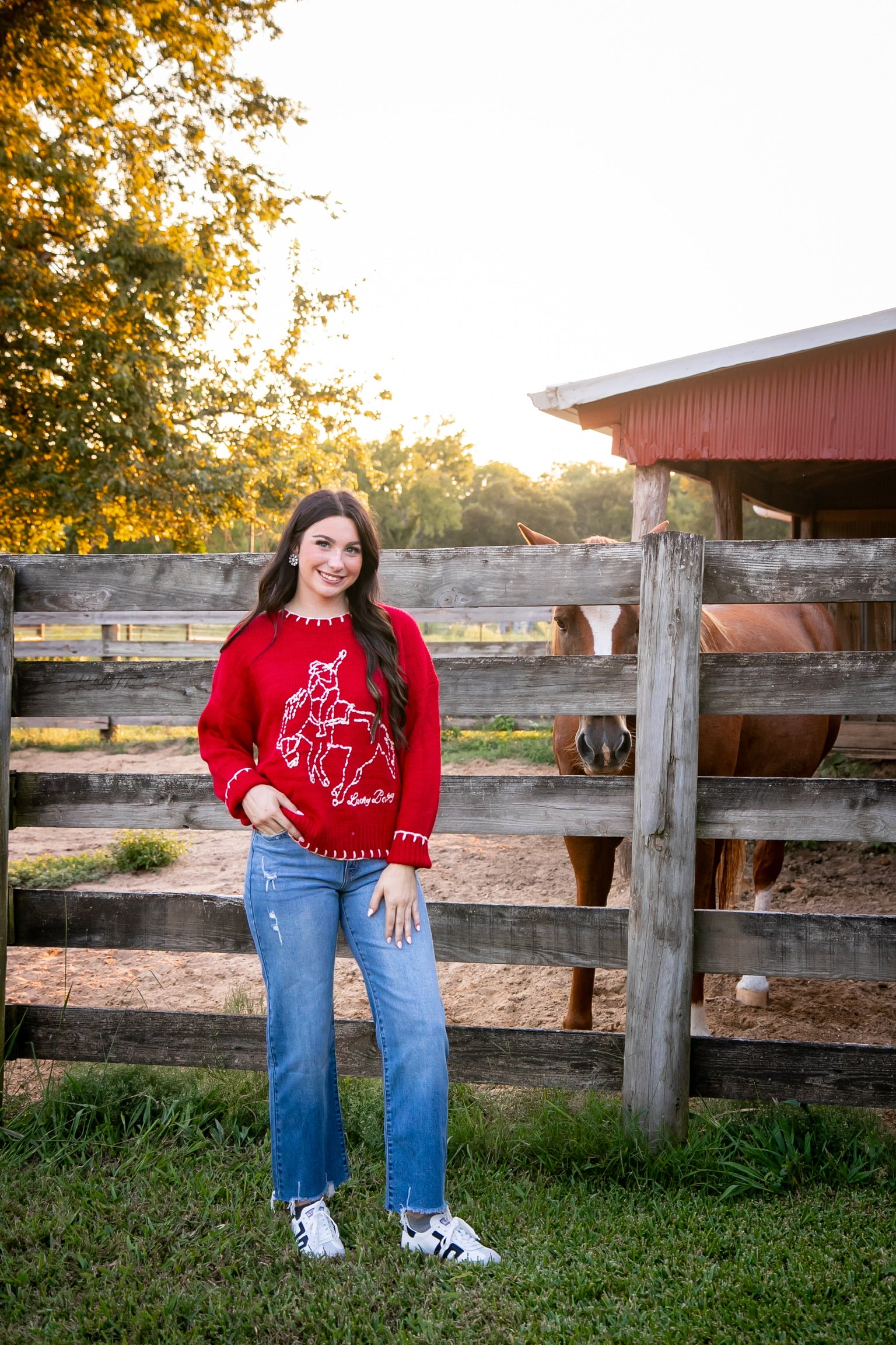 Retro western print with a defined stitch trim on a cherry red knit sweater