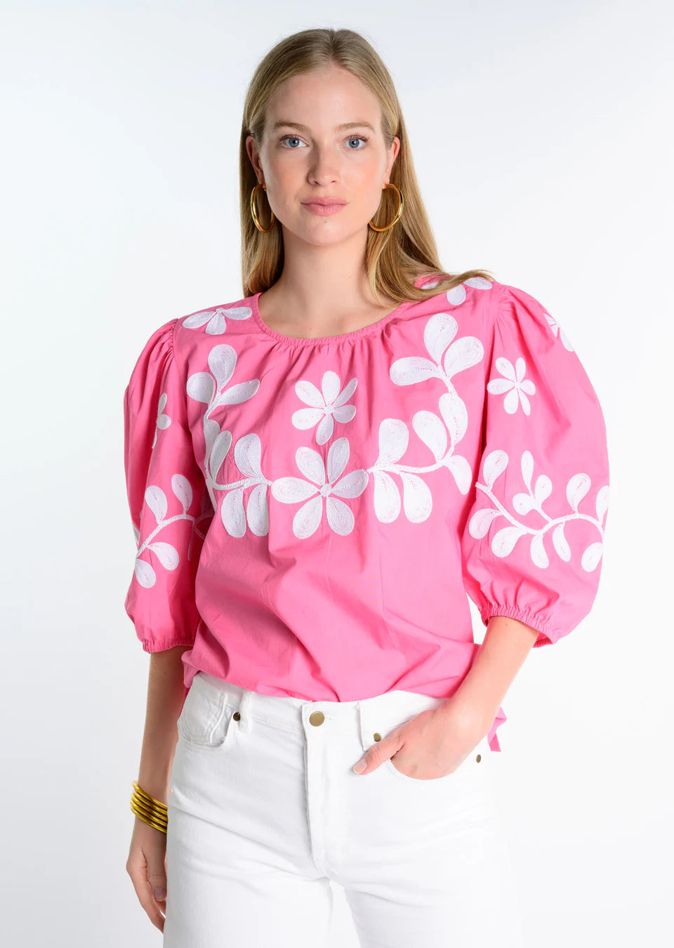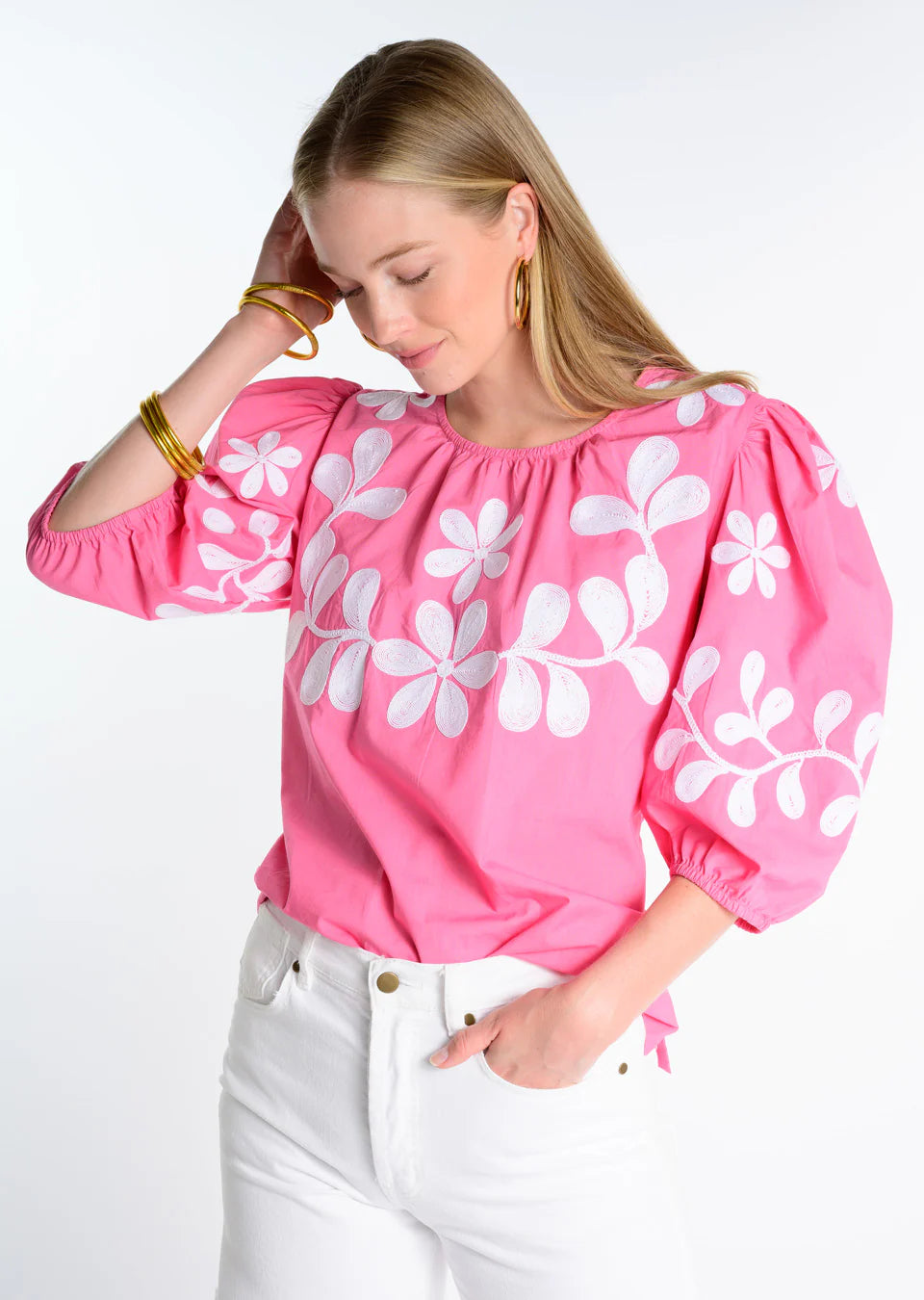 Fresh, playful, and full of charm, the Pink About Town Top is your new go-to for effortless femininity. Crafted from a vibrant pink cotton, this blouse features delicate white floral embroidery and voluminous puff sleeves for a romantic silhouette. Its relaxed fit and gathered neckline make it perfect for styling with crisp white denim or a flirty skirt for an instantly polished look.