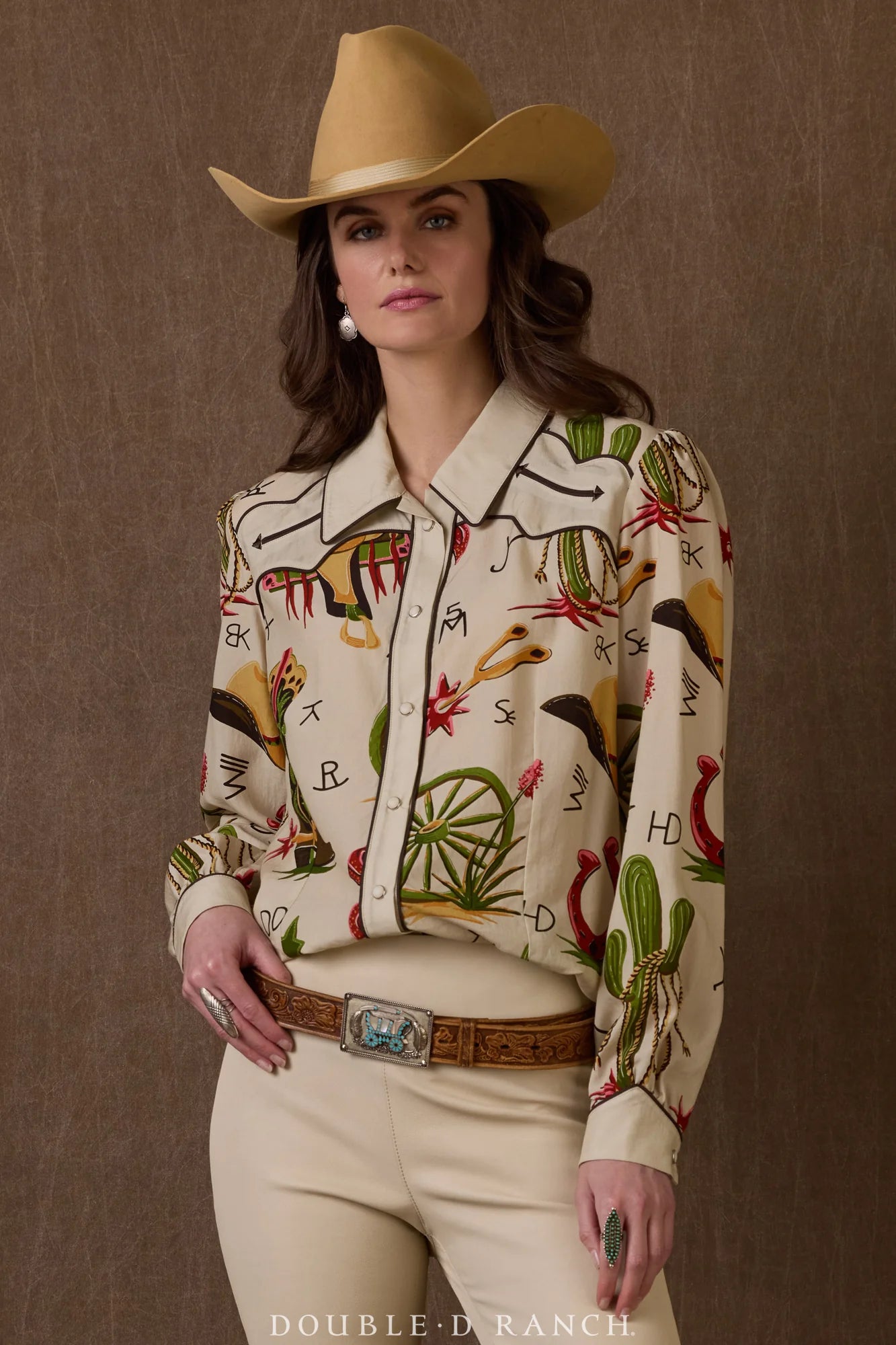 The pearl snap is a quintessential cowgirl classic, and we have reinvented it with next level charm and twang! It’s adorned with this season’s signature print that’s reminiscent of retro Western wallpaper, and the unique yoke and contrasting trim give it a twangy feminine flair. It’s darling with denim and super-chic paired with the bone colored “butter booty” Bandit Pant if you’ve got’em!