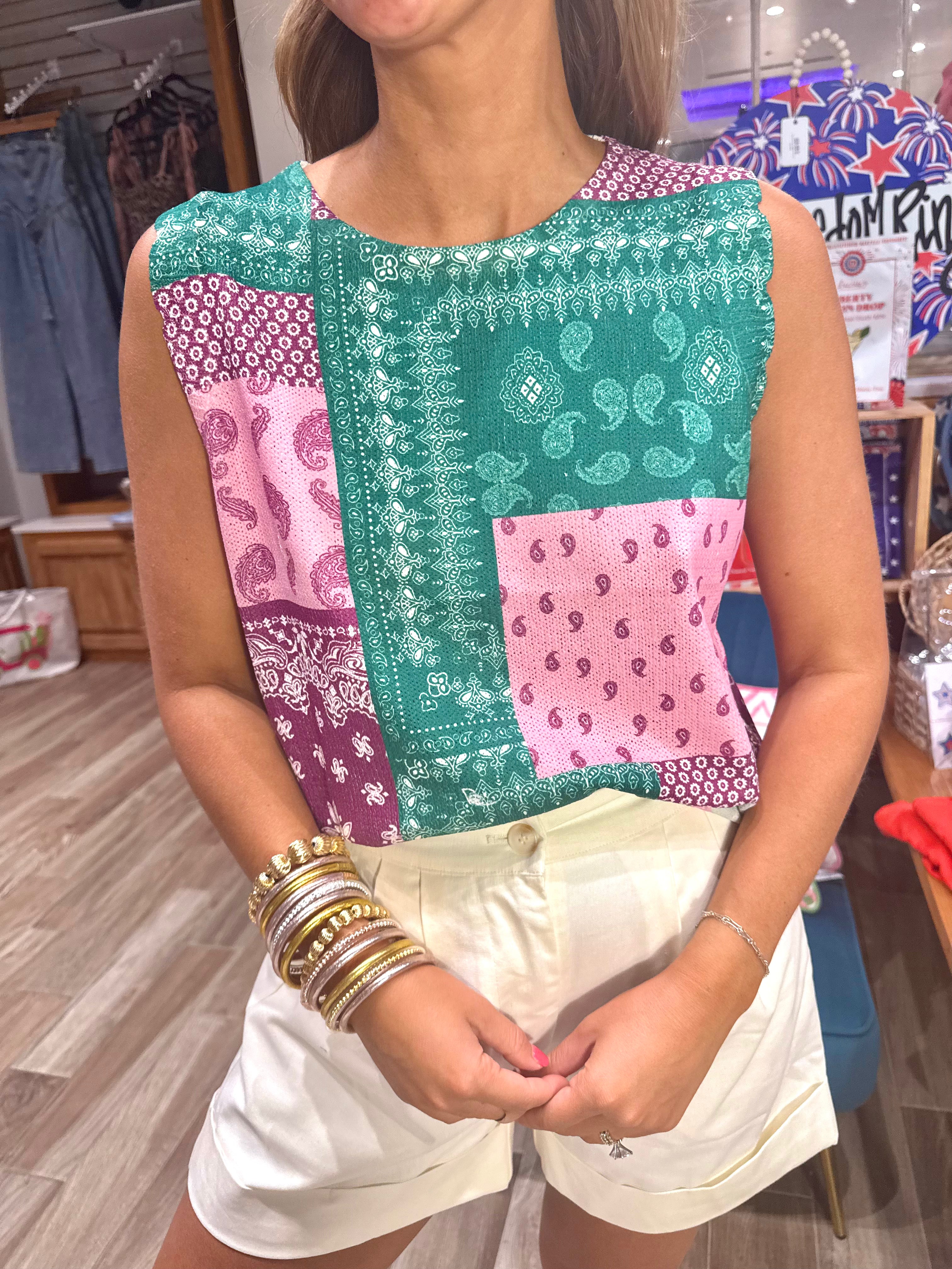 Colorblock Patchwork Paisley Printed Knit Top High gauge knit Colorblock patchwork design Paisley print Round neck Sleeveless Pullover closure Regular fit