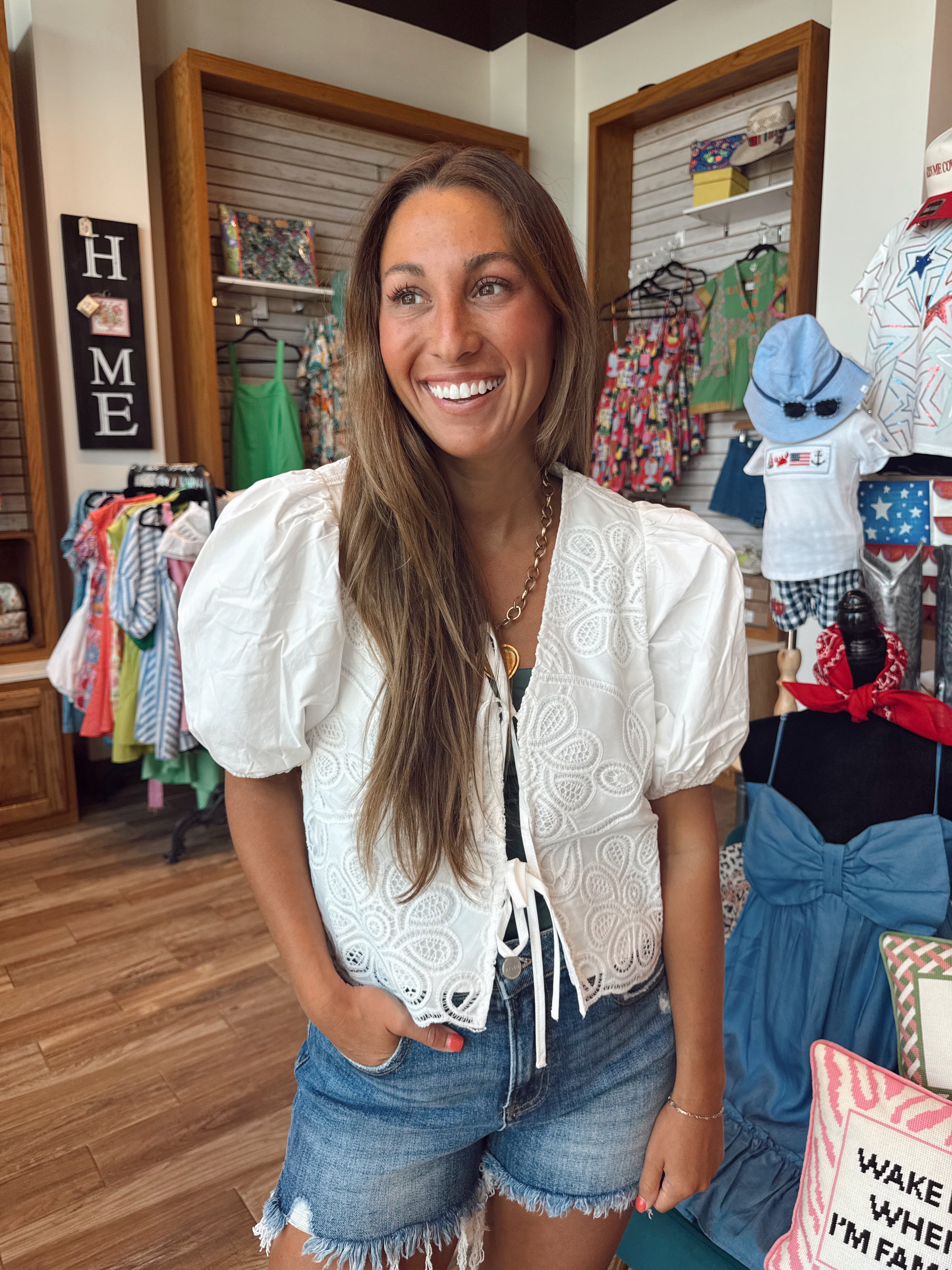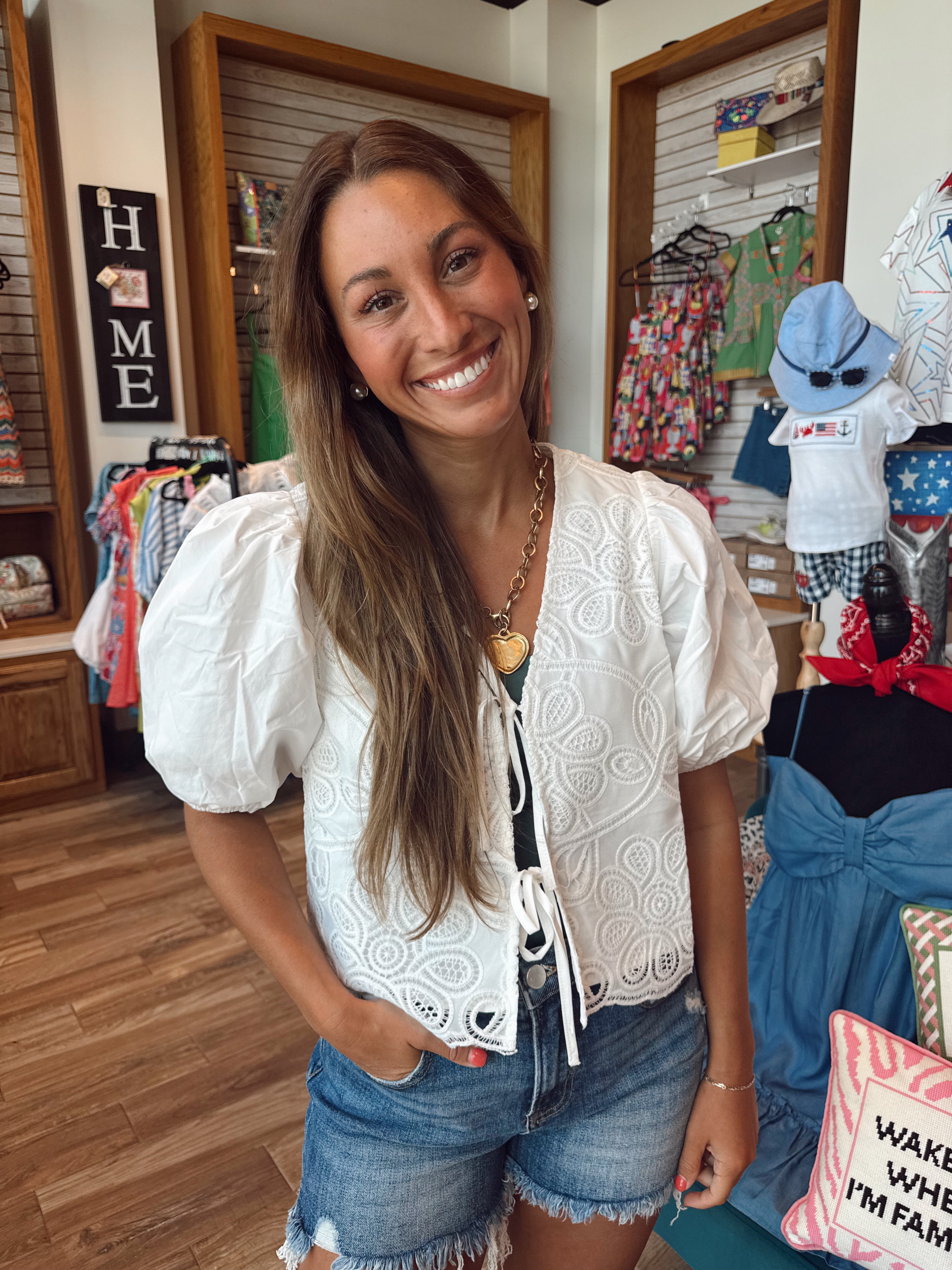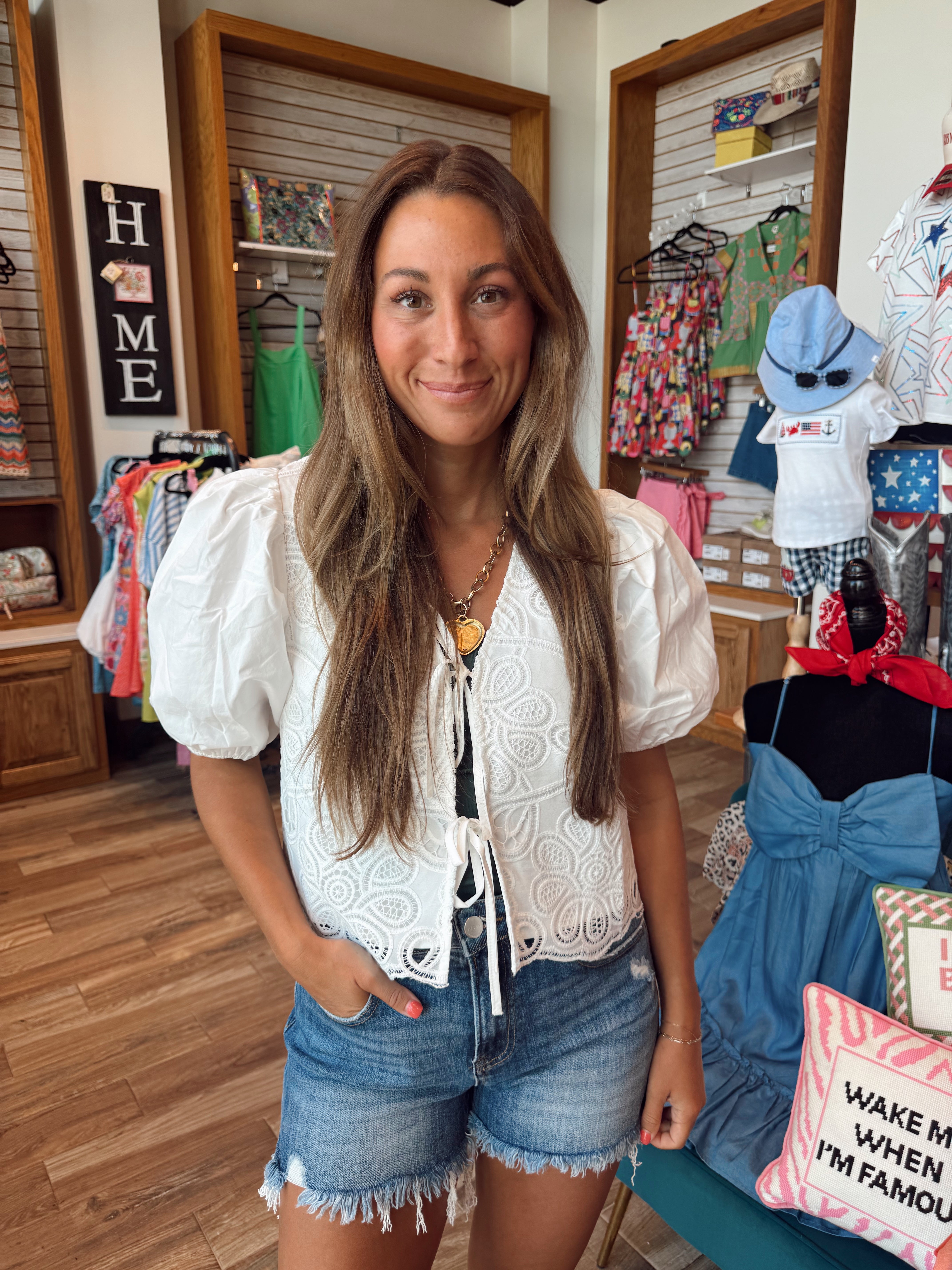 The Correy is so sweet for summertime with eyelet lace trim and front tie neckline. Paired with a classic denim this look is sweet, classy, and sophisticated.