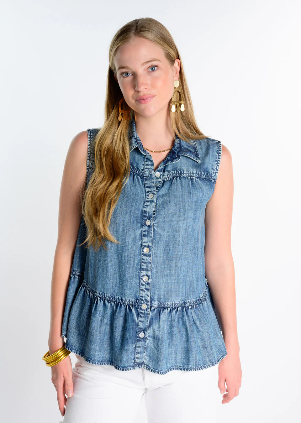 Unleash your playful and quirky side with our Denim Tiered Top by Ivy Jane. This sleeveless summer top features a tiered ruffle design and button-up closure for an effortlessly stylish look. Perfect for those who love to have fun with fashion!