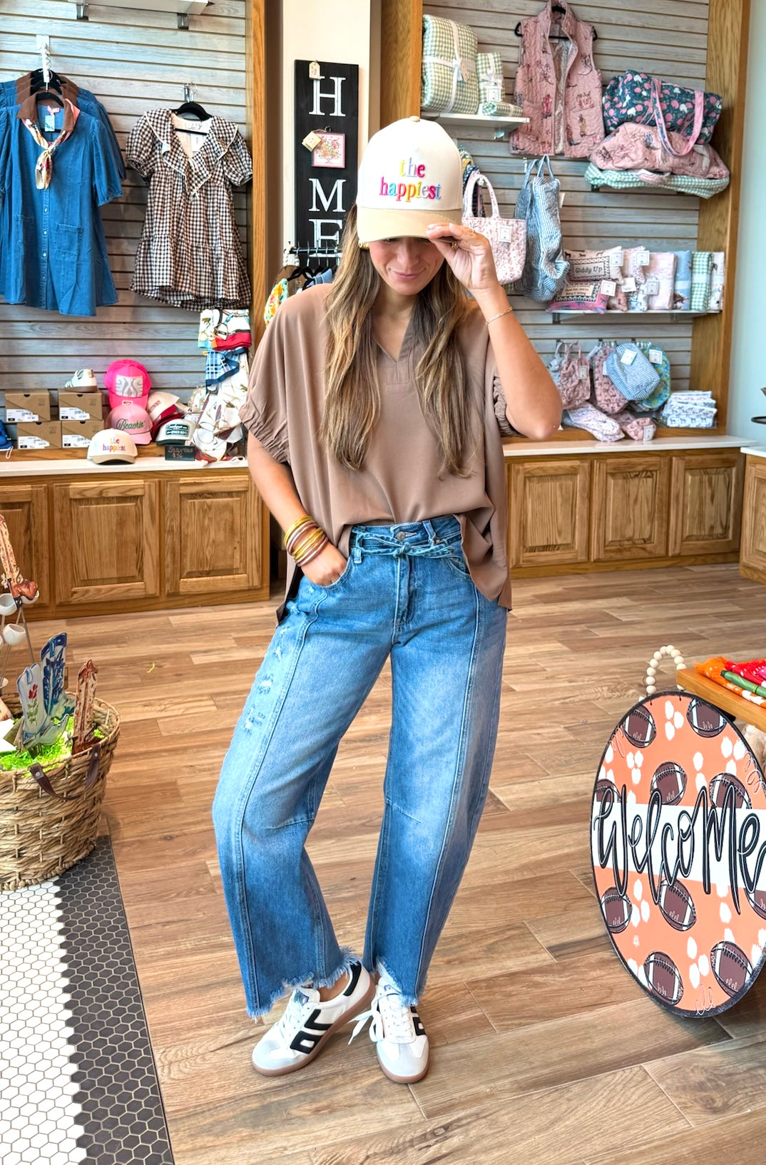 Solid short sleeve top featuring split V-neck with collar band. Elasticated sleeve.