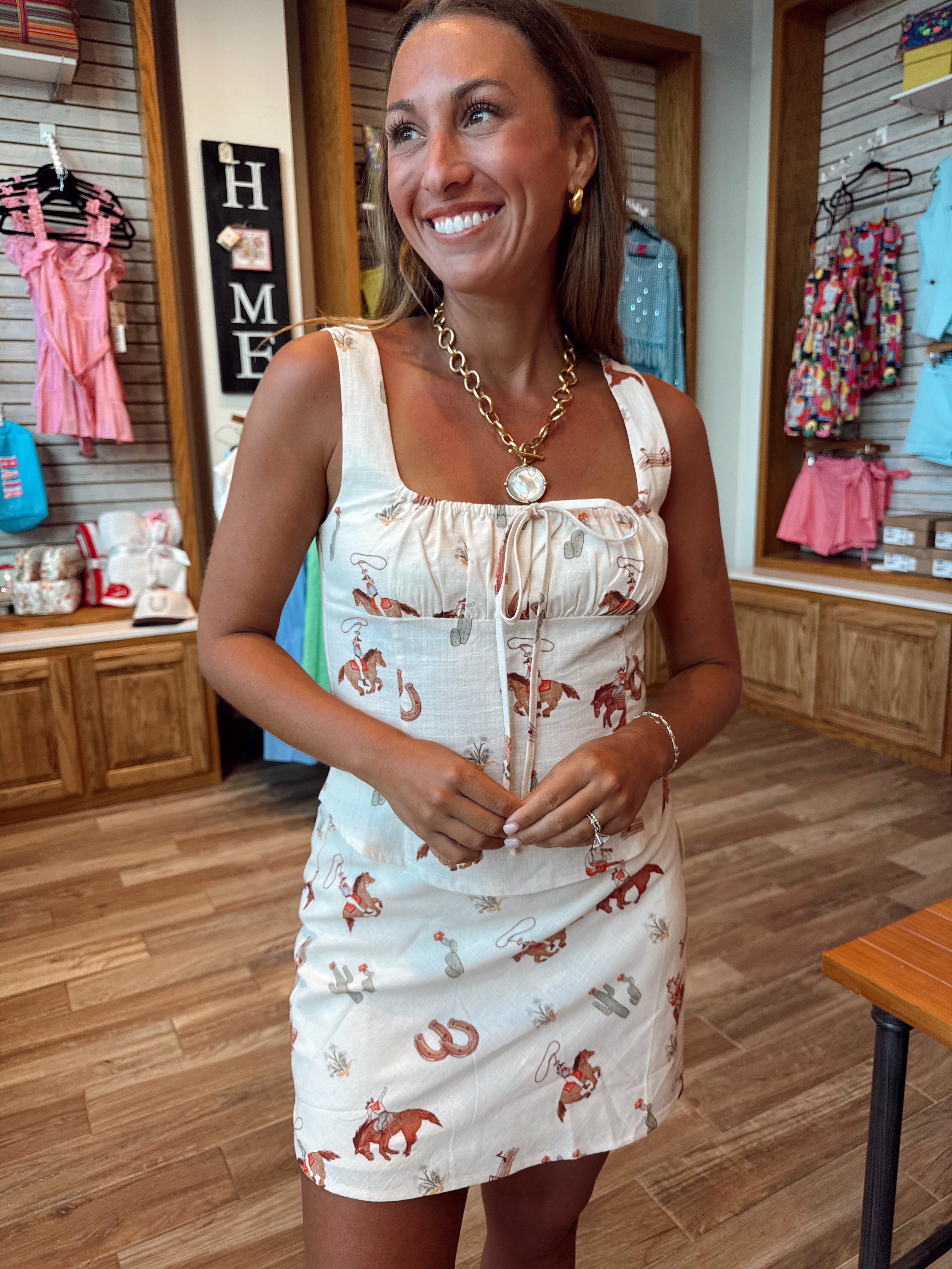 One of our favorite prints in vintage style, this top is so charming, with a ruched lining on the neckline and a fitted bodice. This top pairs so well with the matching skirt to give the illusion of a dress, or it pairs so well with denim and a pair of boots!