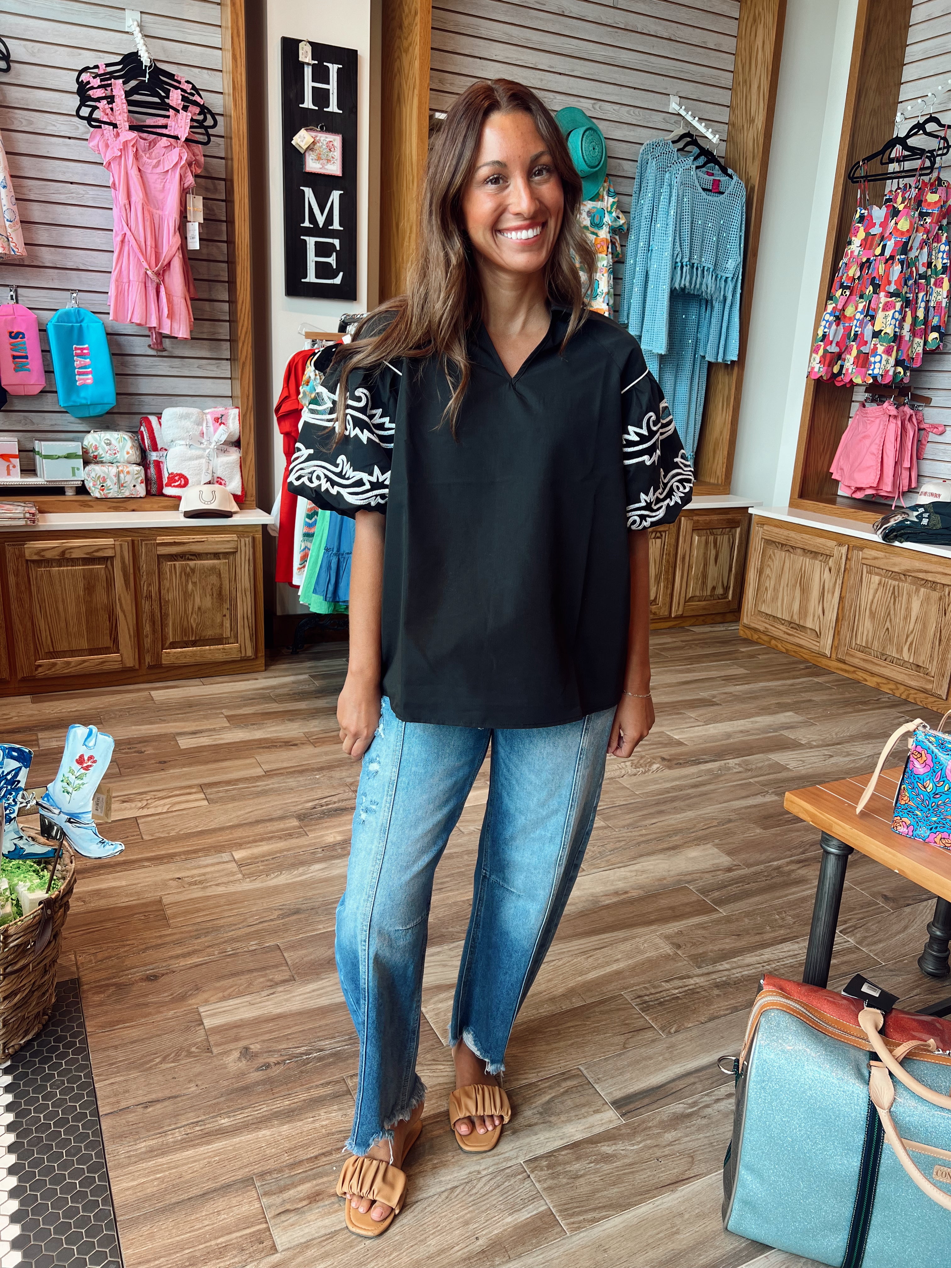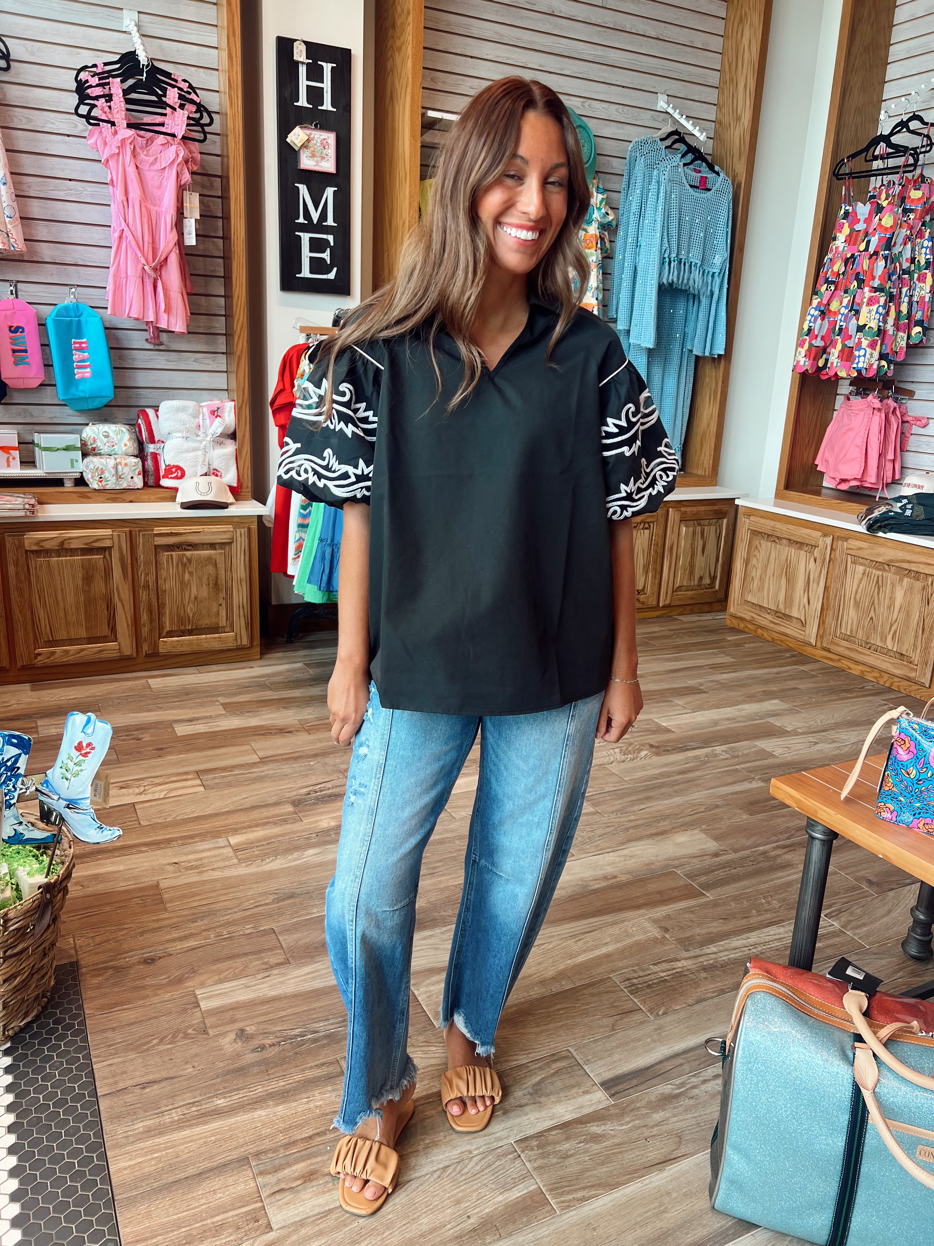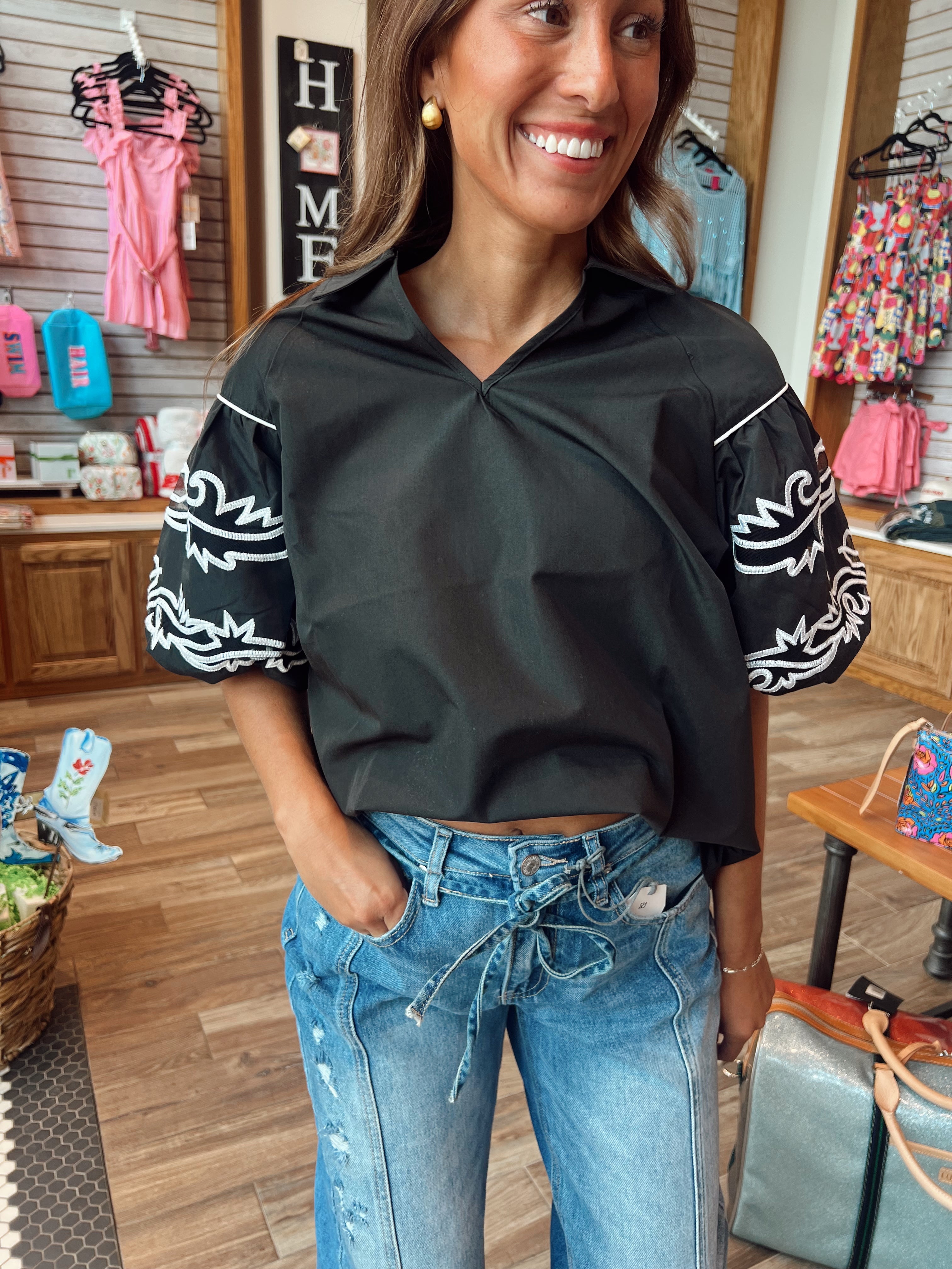 can we just take a moment for these sleeves... we love a good detail moment. this puff sleeve top has that boot stitching detail but done the two fly wayy. white boot stitch effect is embroidered along with a mesh cutout.