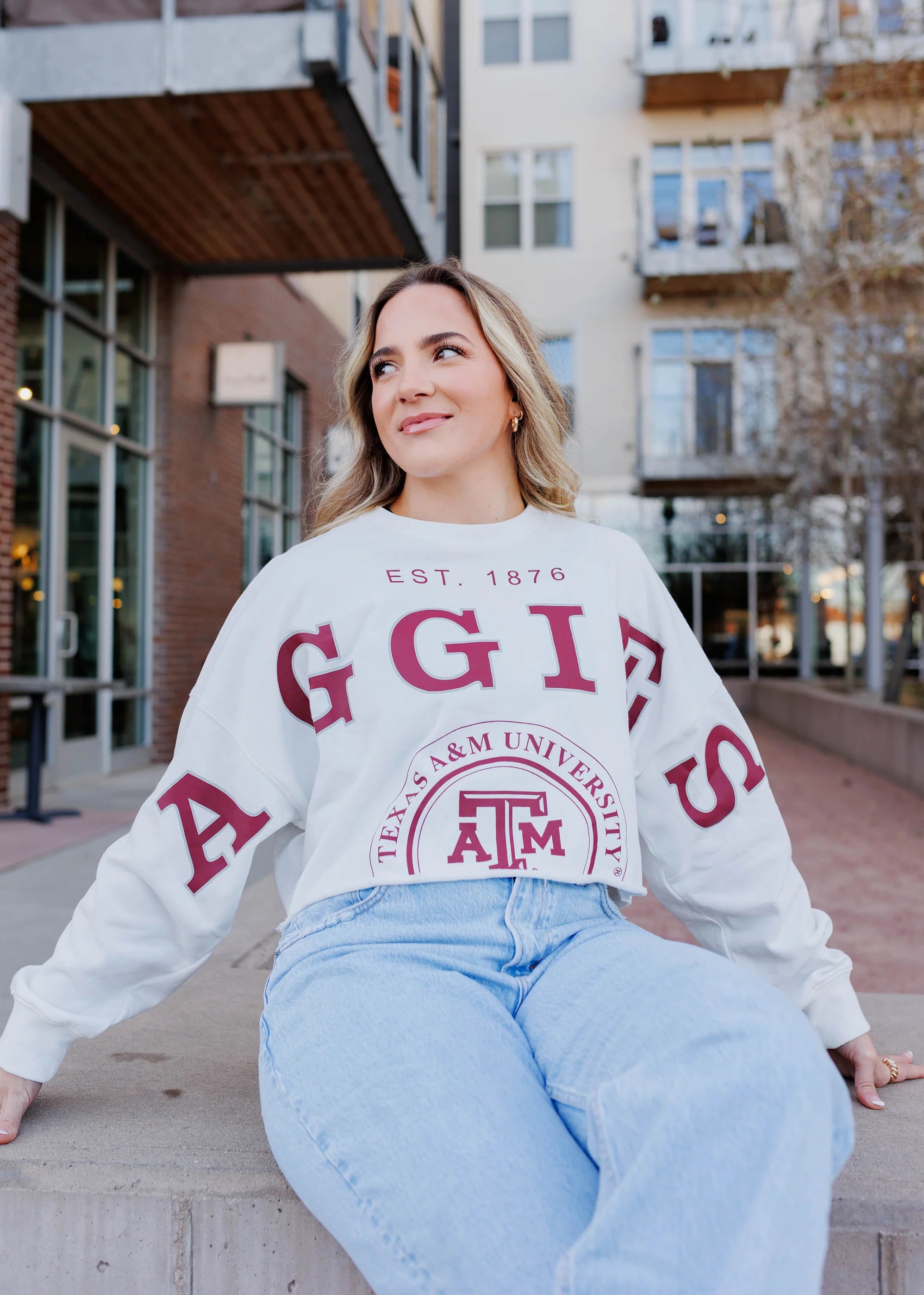 Our Cropped Long Sleeve Crewneck! A GDS favorite featuring a raw hem, dropped shoulder, and the perfect lightweight material. It fits like a dream and adds a girly touch to your collegiate wardrobe. Pairs well with denim shorts and cowboy boots for game day!