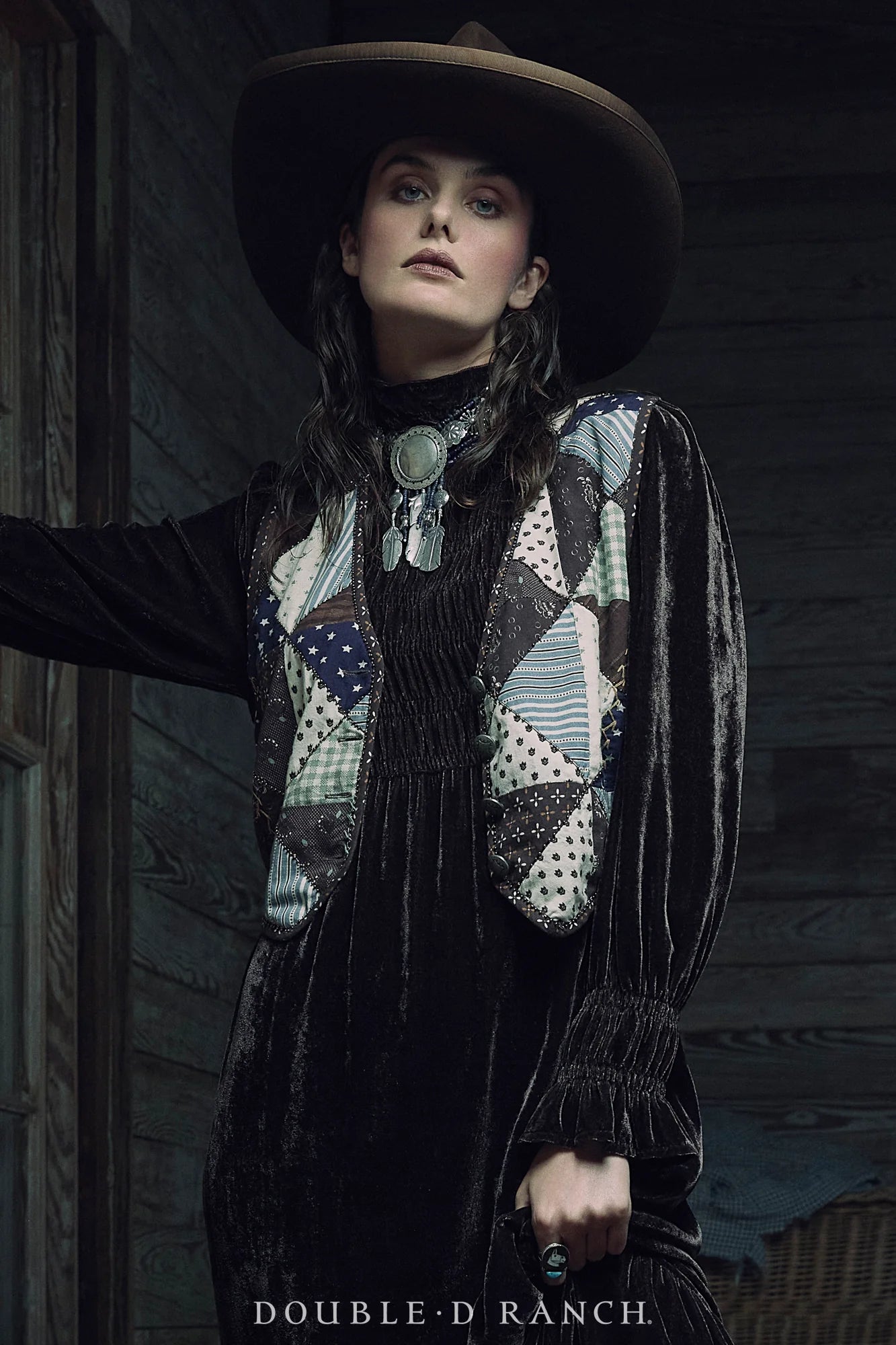 There were dozens of quilts in Granny’s Wash House trunks and that aesthetic is important to this collection. It’s beautifully executed in blues and browns, bringing that vintage vibe to a chic cropped vest silhouette, finished with custom concho buttons. It’s a fabulous piece to jazz up a henley, add a pop to a denim workshirt, or even elevate a simple white tee.