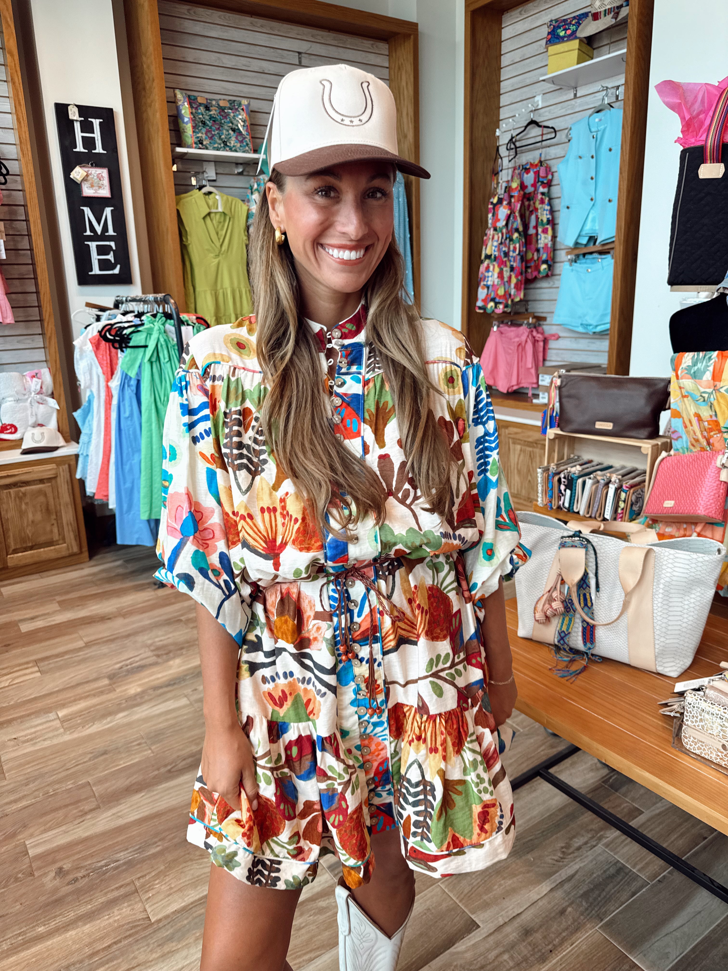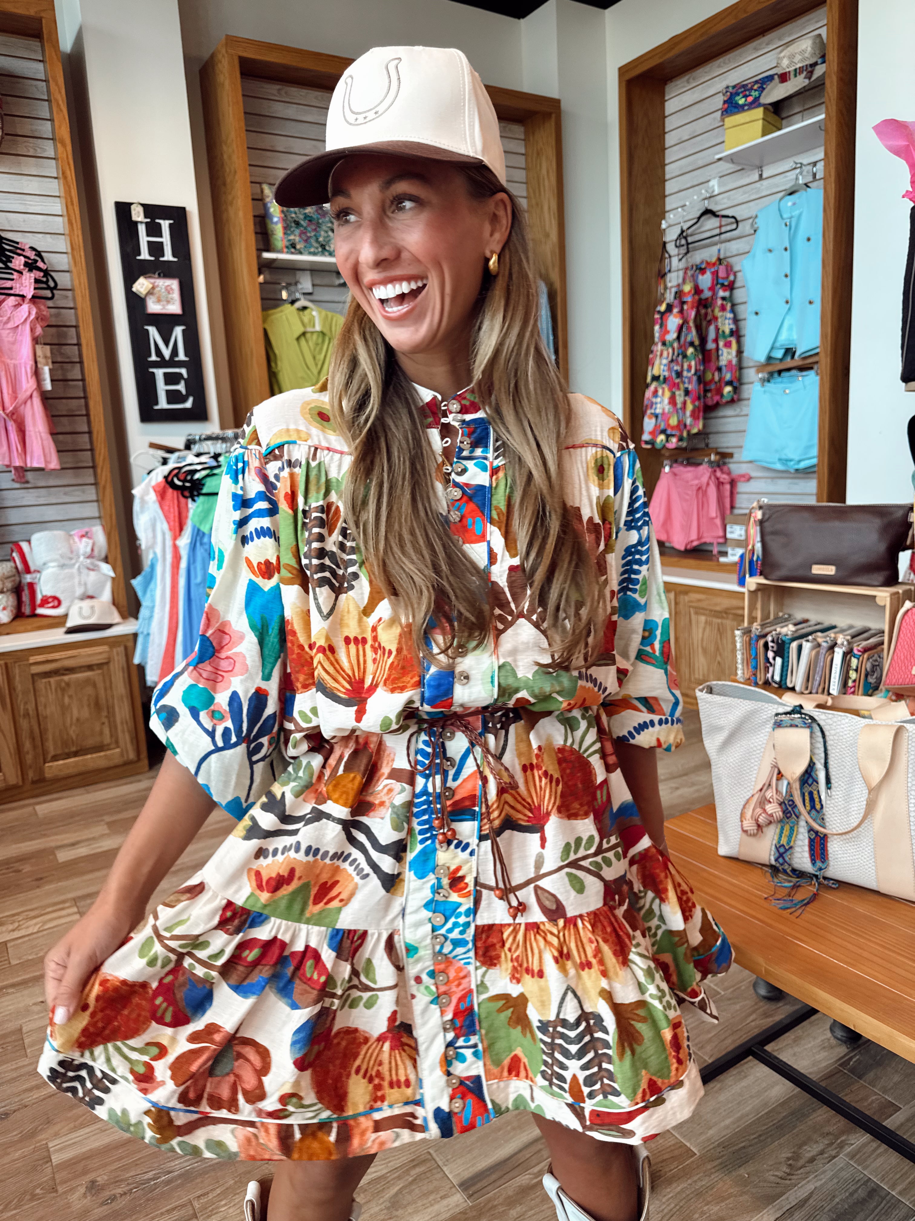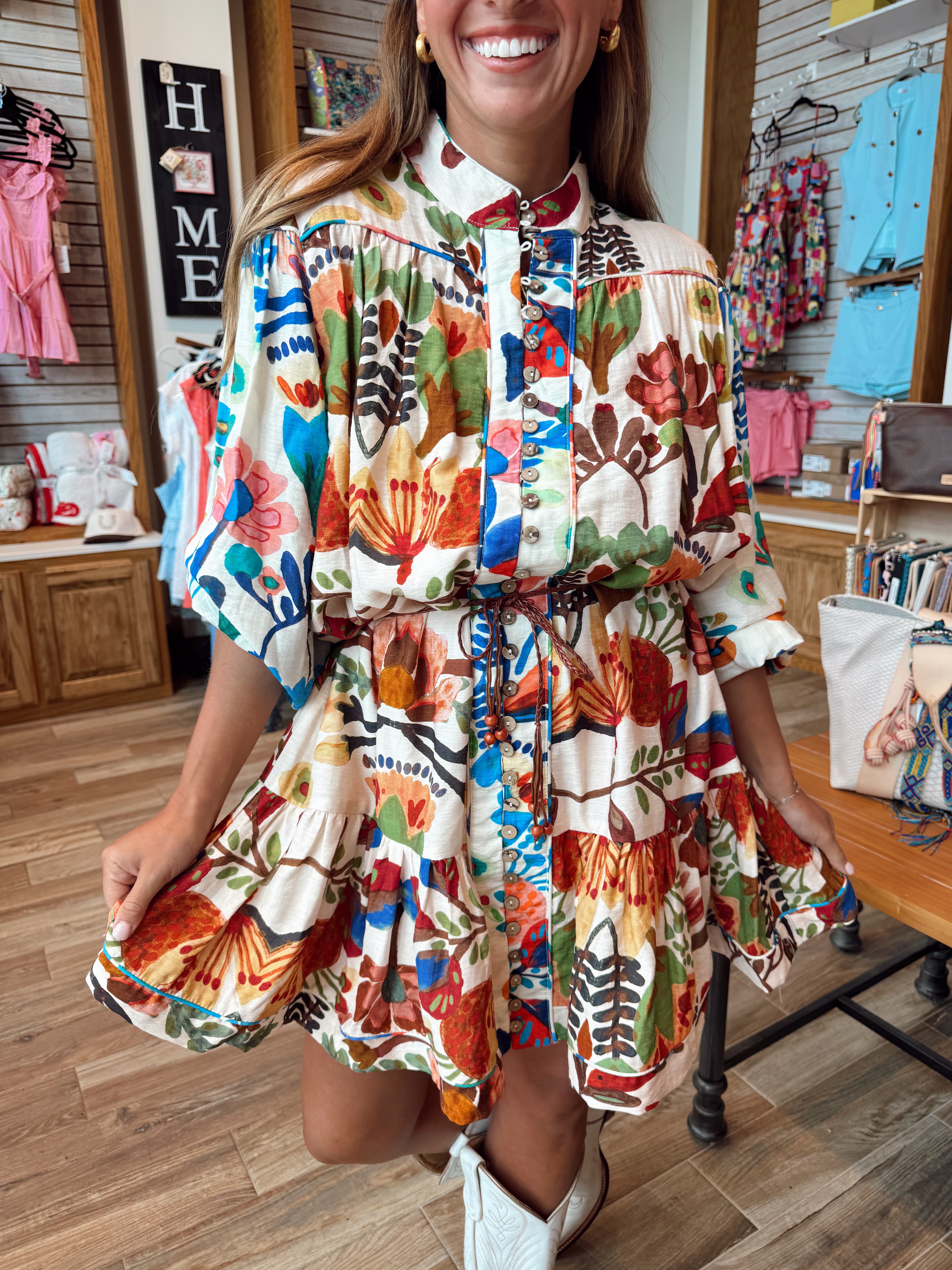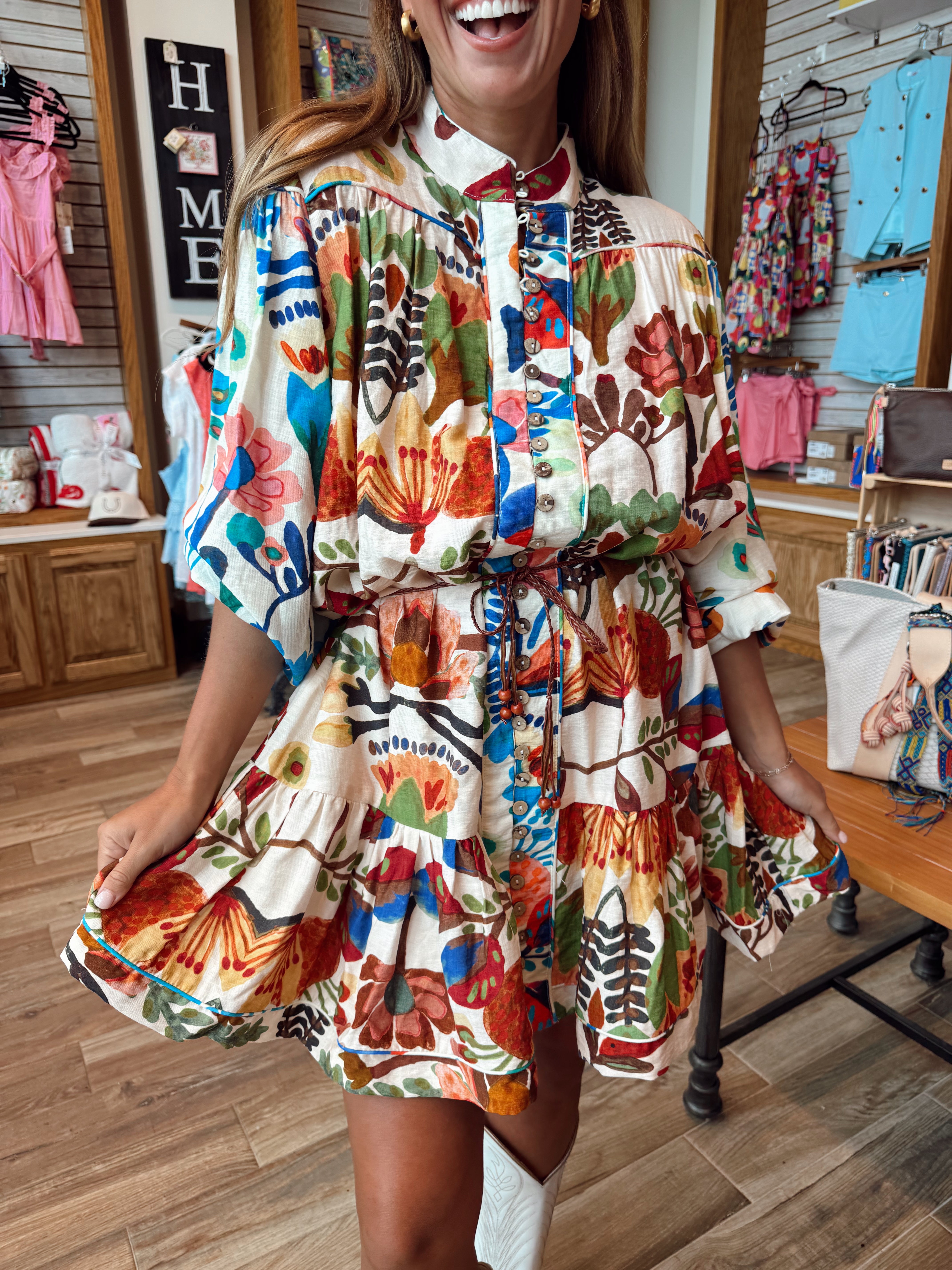 This gorgeous printed dress is fully lined with a button-down front and a braided leather belt detail!