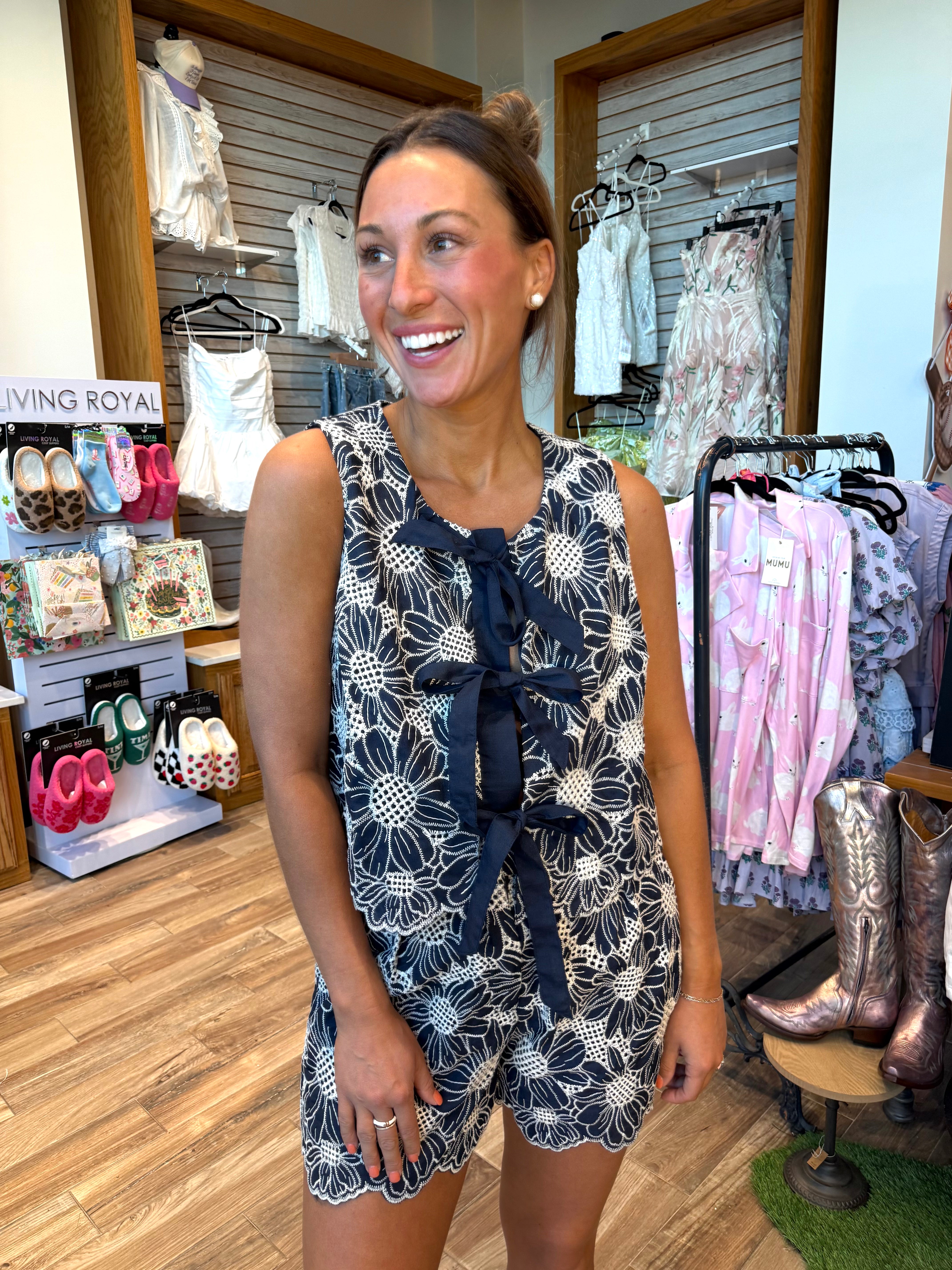 The Brooke two piece set is a navy and cream combo with a tie front top and matching shorts