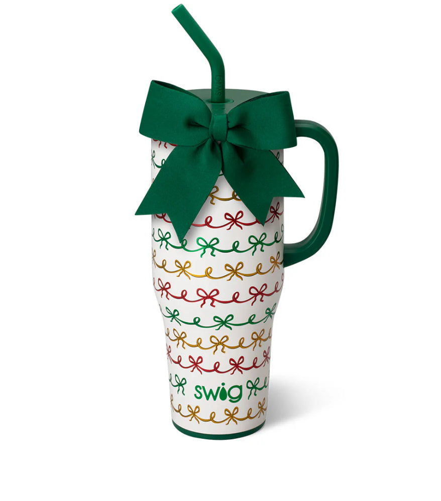 Mega sips, mega chill! π§ Get wrapped up in traditional holiday charm with red, green, and gold metallic bows on a glitter ivory background. A removable charming bow adorns each item like a gift. π
