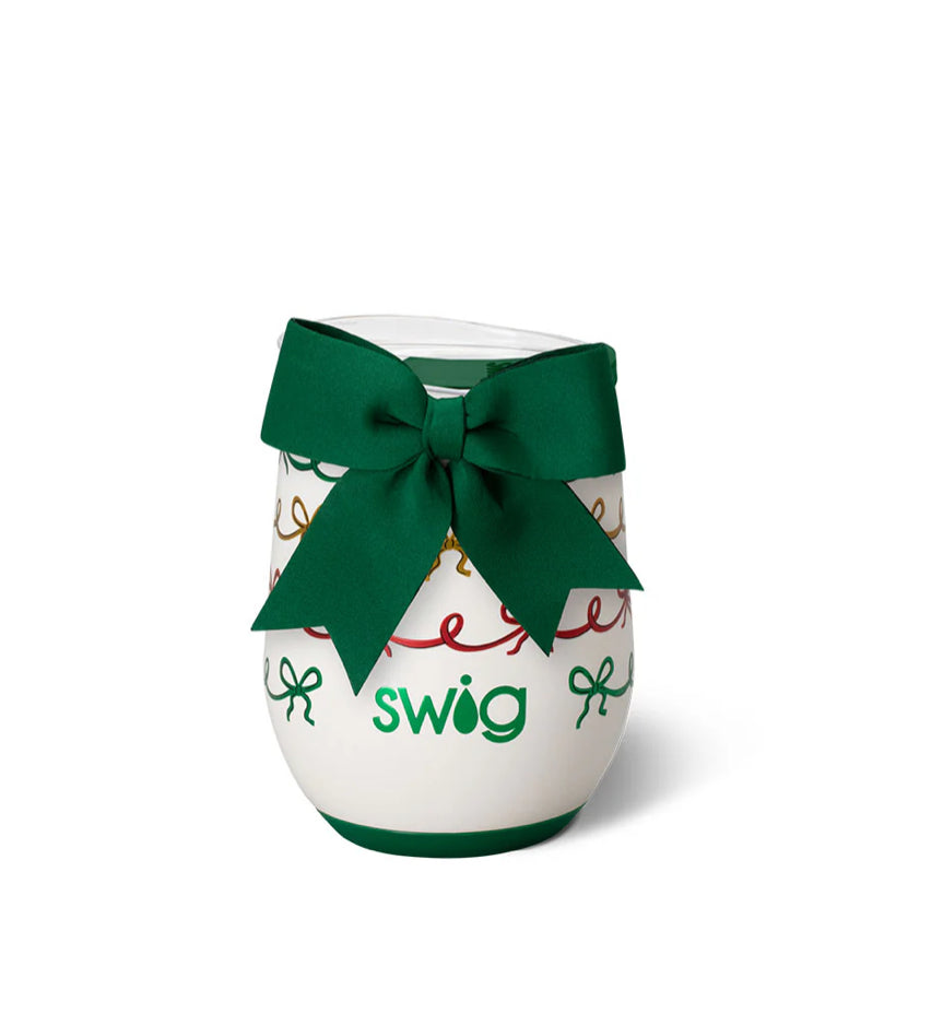 The Swig that started it all! β¨ Get wrapped up in traditional holiday charm with red, green, and gold metallic bows on a glitter ivory background. A removable charming bow adorns each item like a gift. π