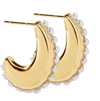 Wren is a stainless steel hoop with inlaid synthetic pearls. It is hypo-allergenic and waterproof. The hoop is 30mm in length.
